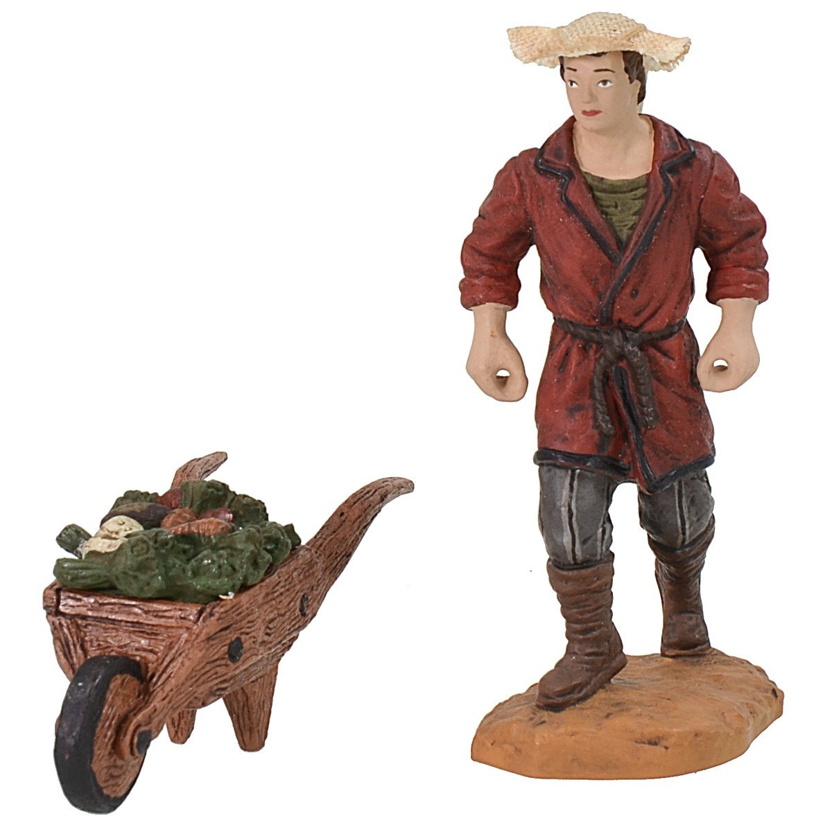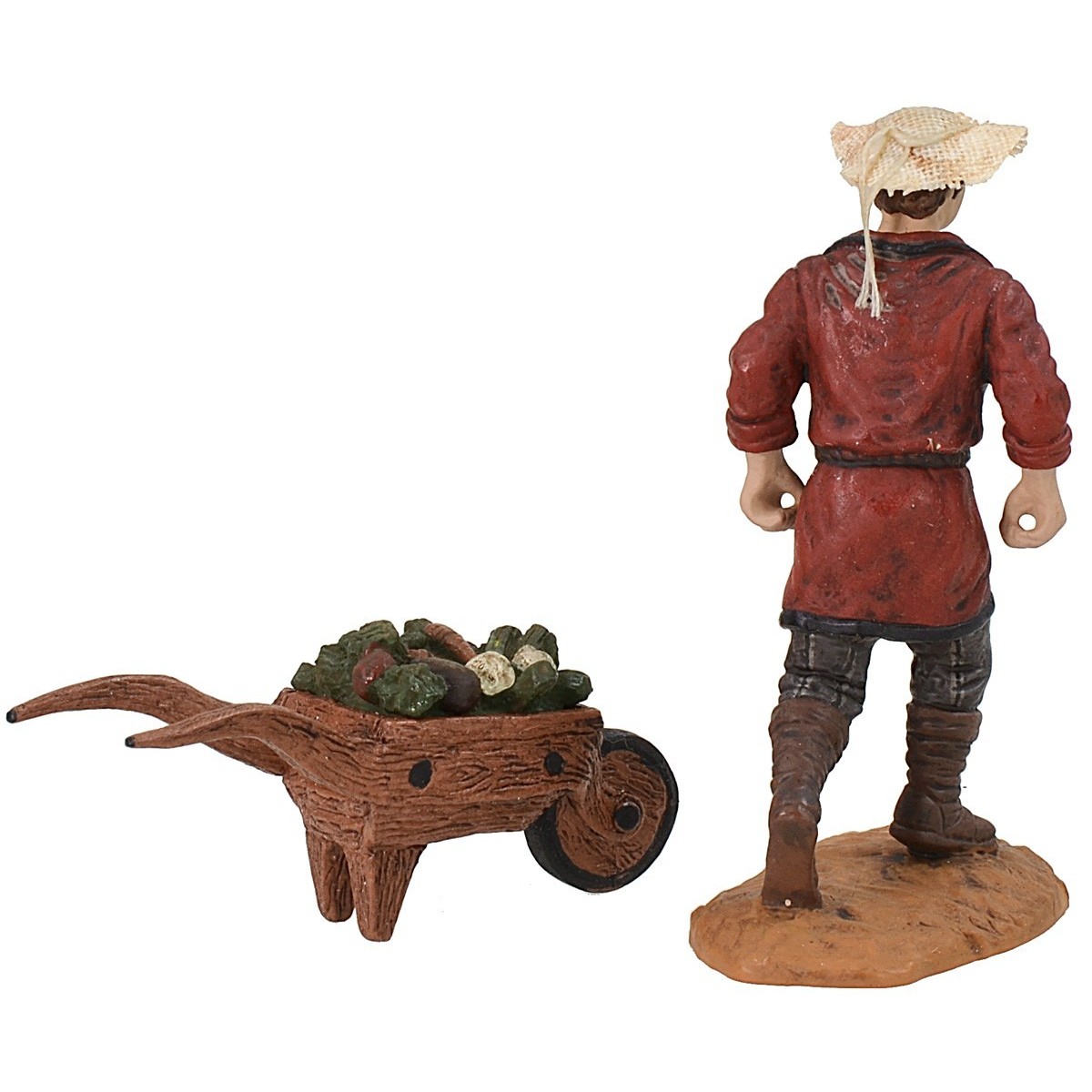 Contadino con carriola di verdure e cappello in tessuto 10 cm Oliver. Le statue della medesima serie hanno volti espressivi e ben rifiniti nei dettagli.