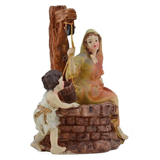 Pozzo per presepe in resina con donna e bambino seduti sul bordo serie 12 cm. La resina colorata all'interno del pozzo produce un effetto quasi reale della presenza dell acqua.