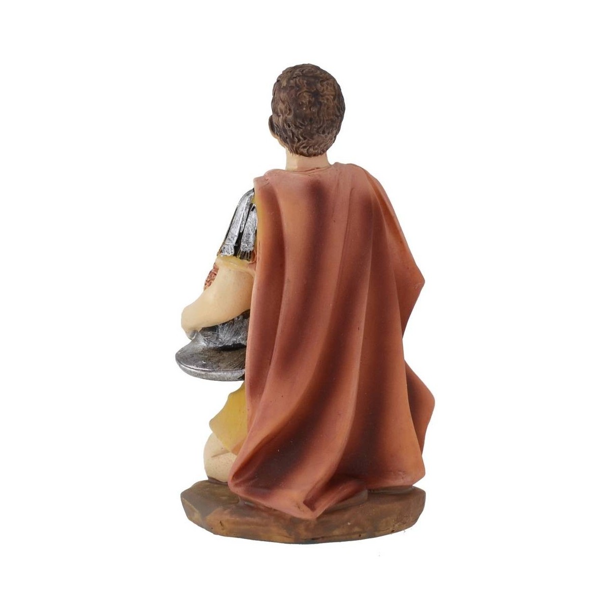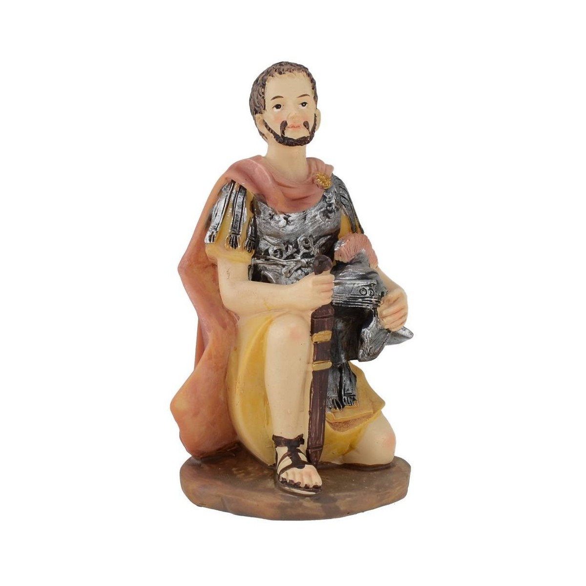 Soldato in ginocchio con pugnale e elmo in mano, mantello rosso con coccarda color oro, serie 15 cm in resina.