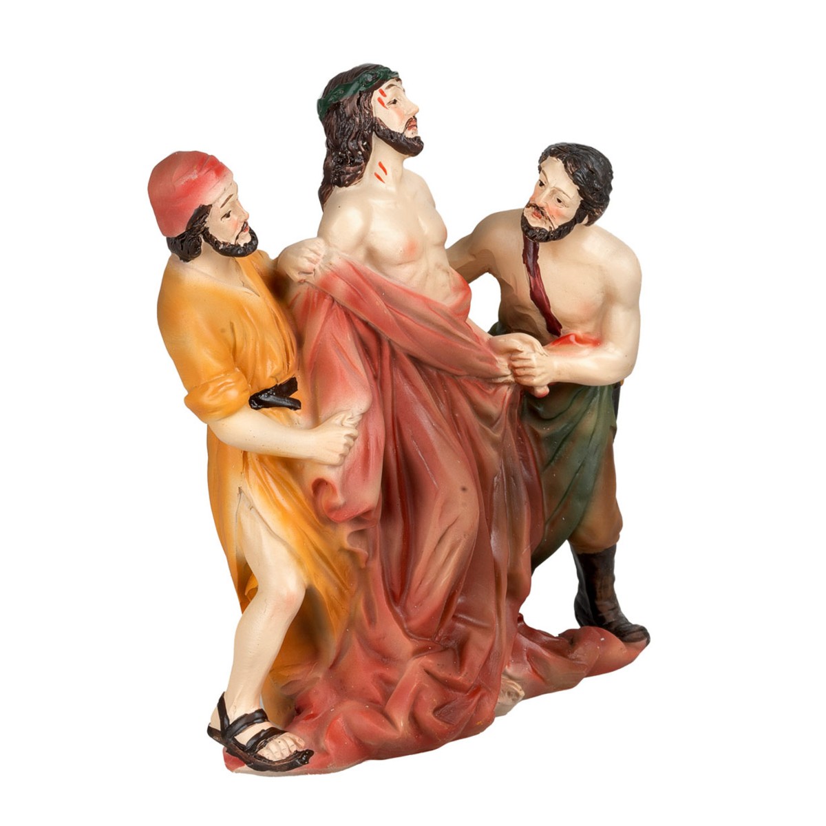 La scena della svestizione di Cristo, realizzata in resina, include tre soggetti: Gesù e due soldati romani. Le statuine, rifinite nei dettagli, sono ideali per la creazione di composizioni pasquali come diorami e presepi. Gesù è rappresentato al centro, con il capo chinato e lo sguardo sofferente, indossa soltanto un drappo rosso mentre i due soldati romani, uno indossante una tunica gialla e un copricapo rosso e l'altro vestito di verde e rosso, sono impegnati nell'atto di privarlo delle sue vesti. Questa scena rappresenta un momento doloroso della Passione di Cristo, richiamando la sofferenza e l'umiliazione subite prima della crocifissione, riflettendo sul sacrificio e l'amore profondo donato da Gesù fino alla fine.