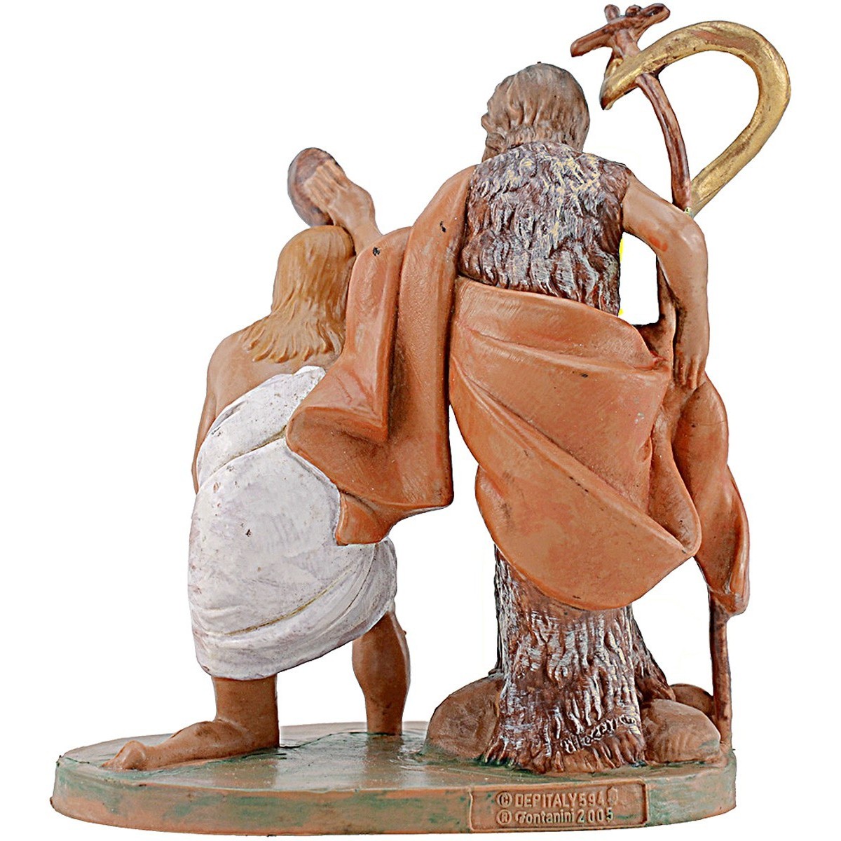 Battesimo di Gesù, 12 cm della Fontanini. Allora giunse Gesù dalla galilea al Giordano, da Giovanni per essere battezzato. Gesù appena battezzato, usci dall'acqua. Or ecco gli si aprirono i cieli e Giovanni vide lo spirito di Dio venir sopra di lui. Ed ecco una voce dai cieli che dice: "Questo è il figlio mio diletto, nel quale mi sono compiaciuto".