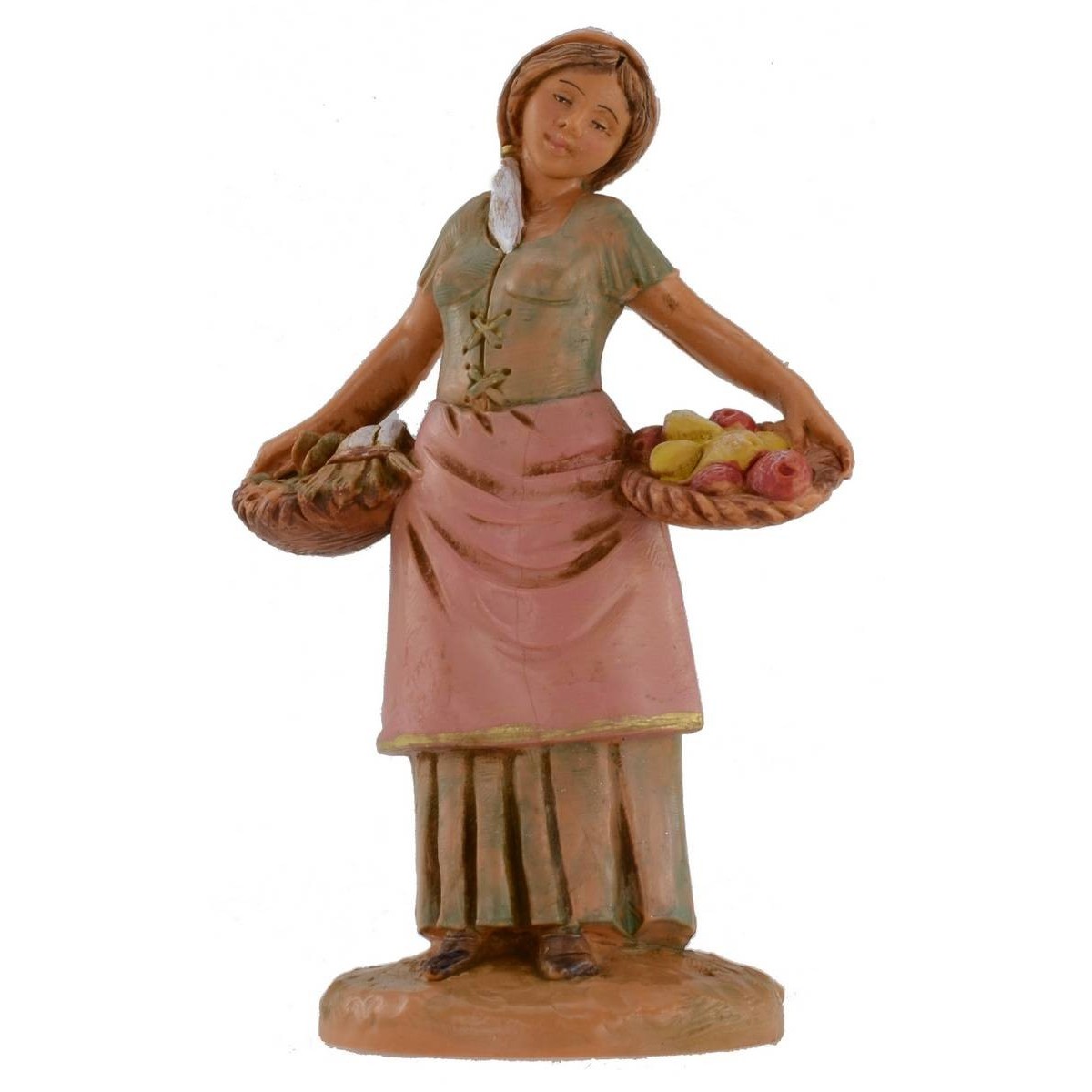 Donna con cesti di frutta e verdura, serie 12 cm Fontanini dipinta a mano. Le statue del presepe tradizionale Fontanini hanno volti espressivi e ben rifiniti nei dettagli.