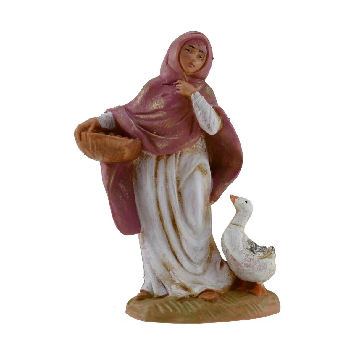 Donna con cesto di frutta in mano accompagnata da un'oca, di altezza 12 cm. La figura è realizzata in pvc e dipinta a mano. Si precisa che le statue del presepe tradizionale Fontanini, sono prodotte in Italia, caratterizzate da volti espressivi e ben rifiniti nei dettagli.