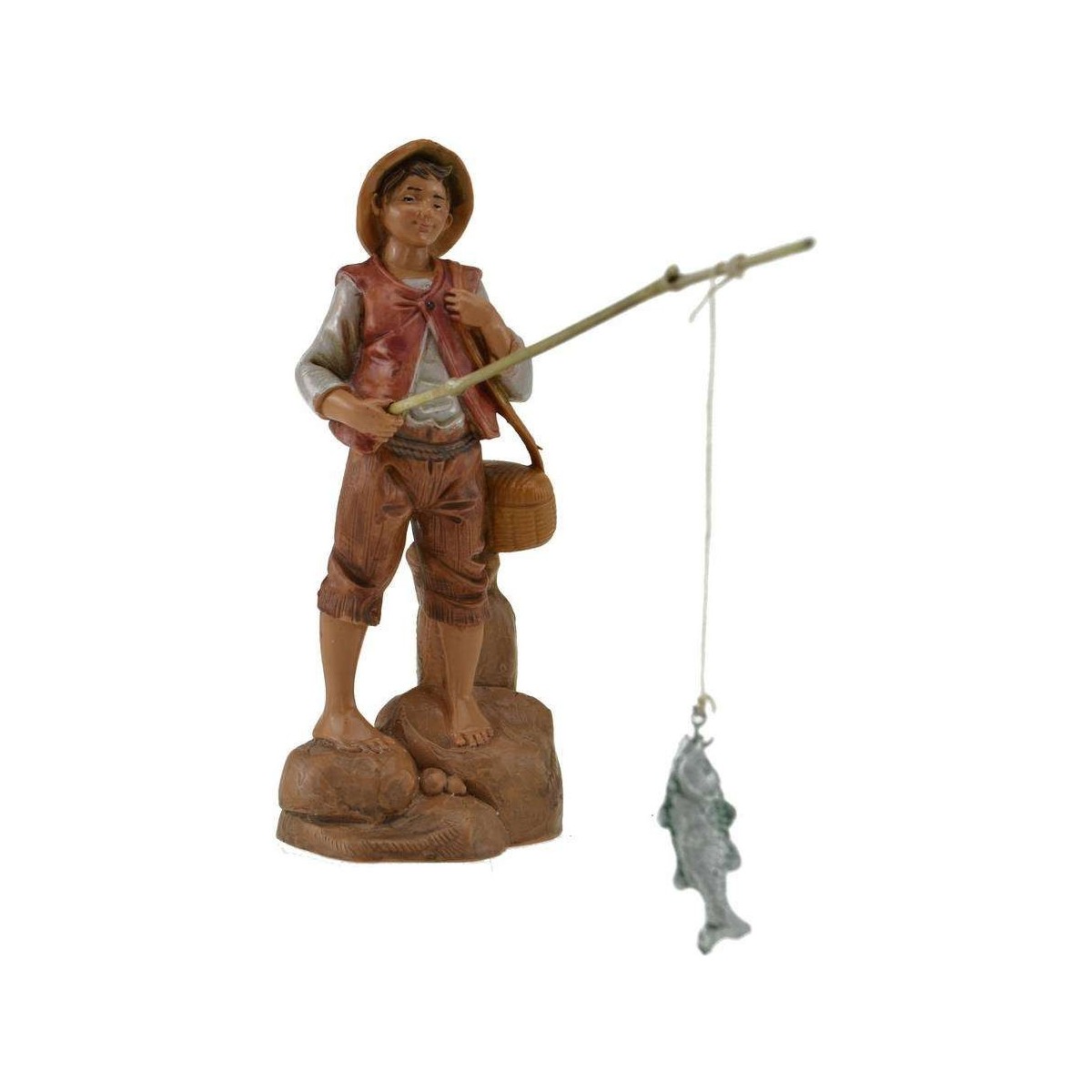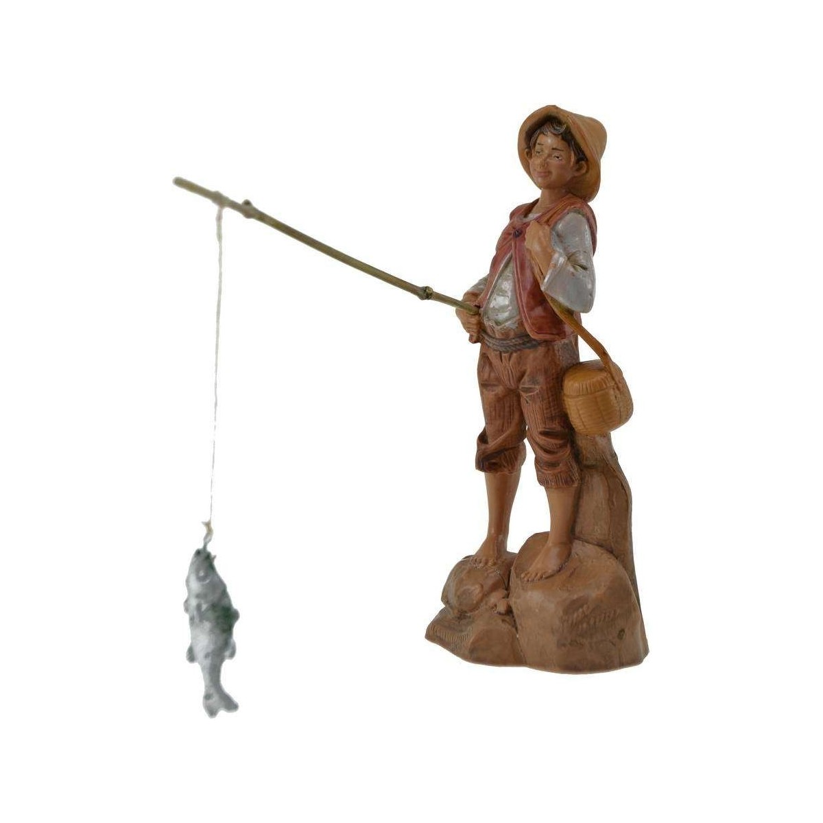 Pescatore con canna e pesce su rocce, serie Fontanini 12 cm.