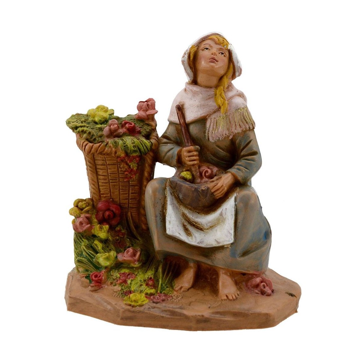 Donna seduta al lavoro con vasi di fiori della Fontanini, serie 12 cm.