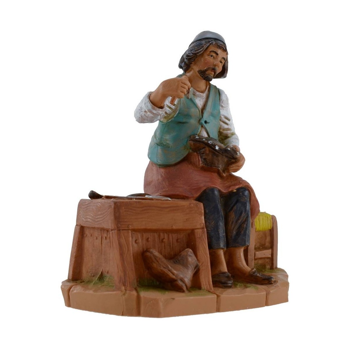 Calzolaio seduto al lavoro serie 12 cm Fontanini dipinto a mano. Le statue del presepe tradizionale Fontanini hanno volti espressivi e ben rifiniti nei dettagli.