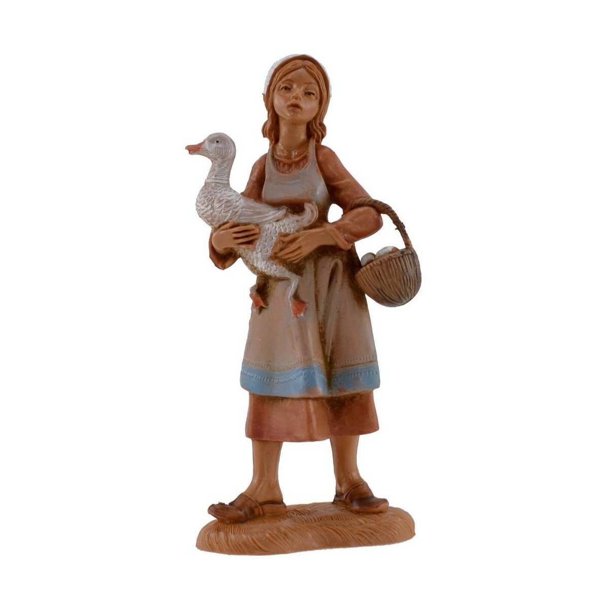Donna con oca e cesto serie 12 cm Fontanini dipinto a mano. Le statue del presepe tradizionale Fontanini hanno volti espressivi e ben rifiniti nei dettagli.