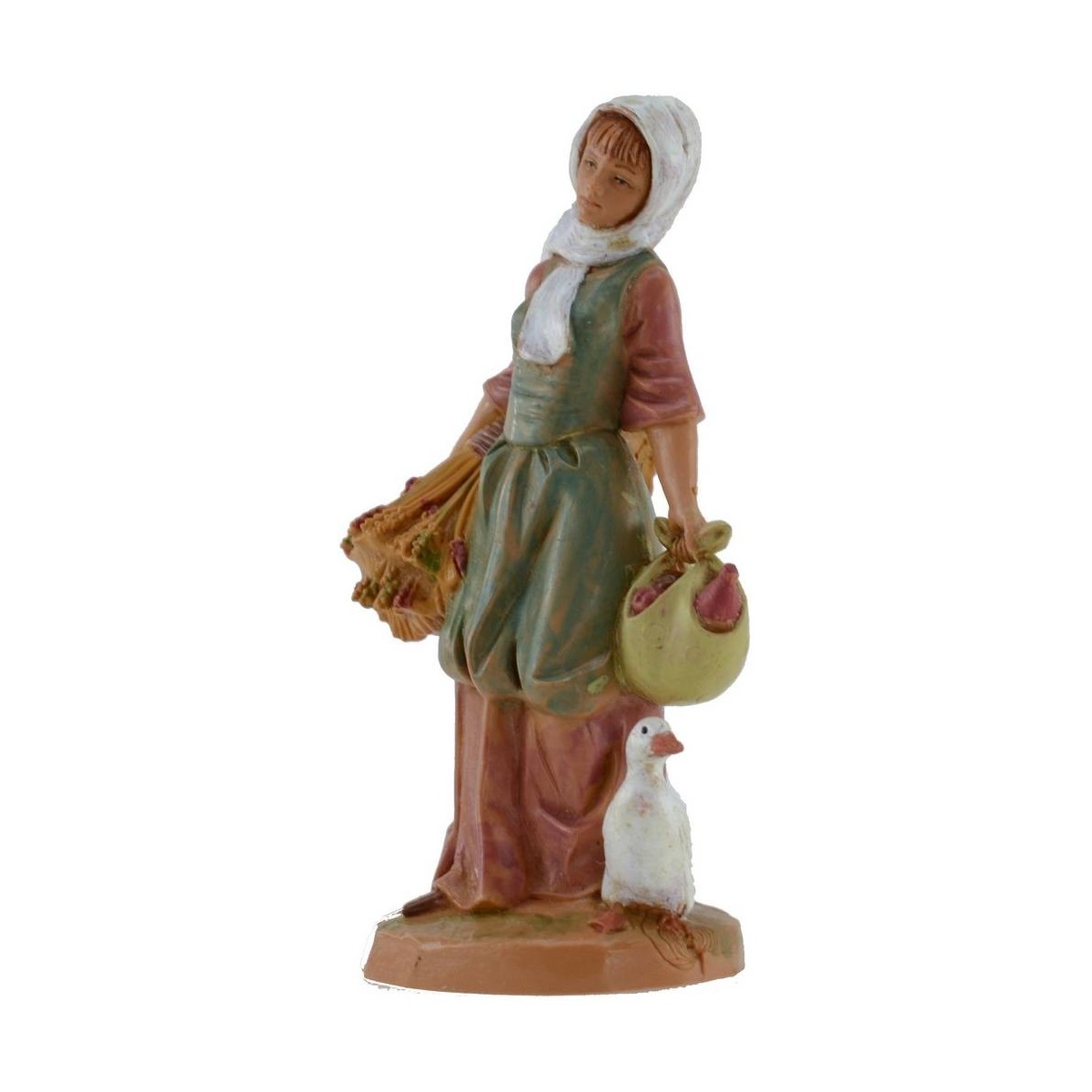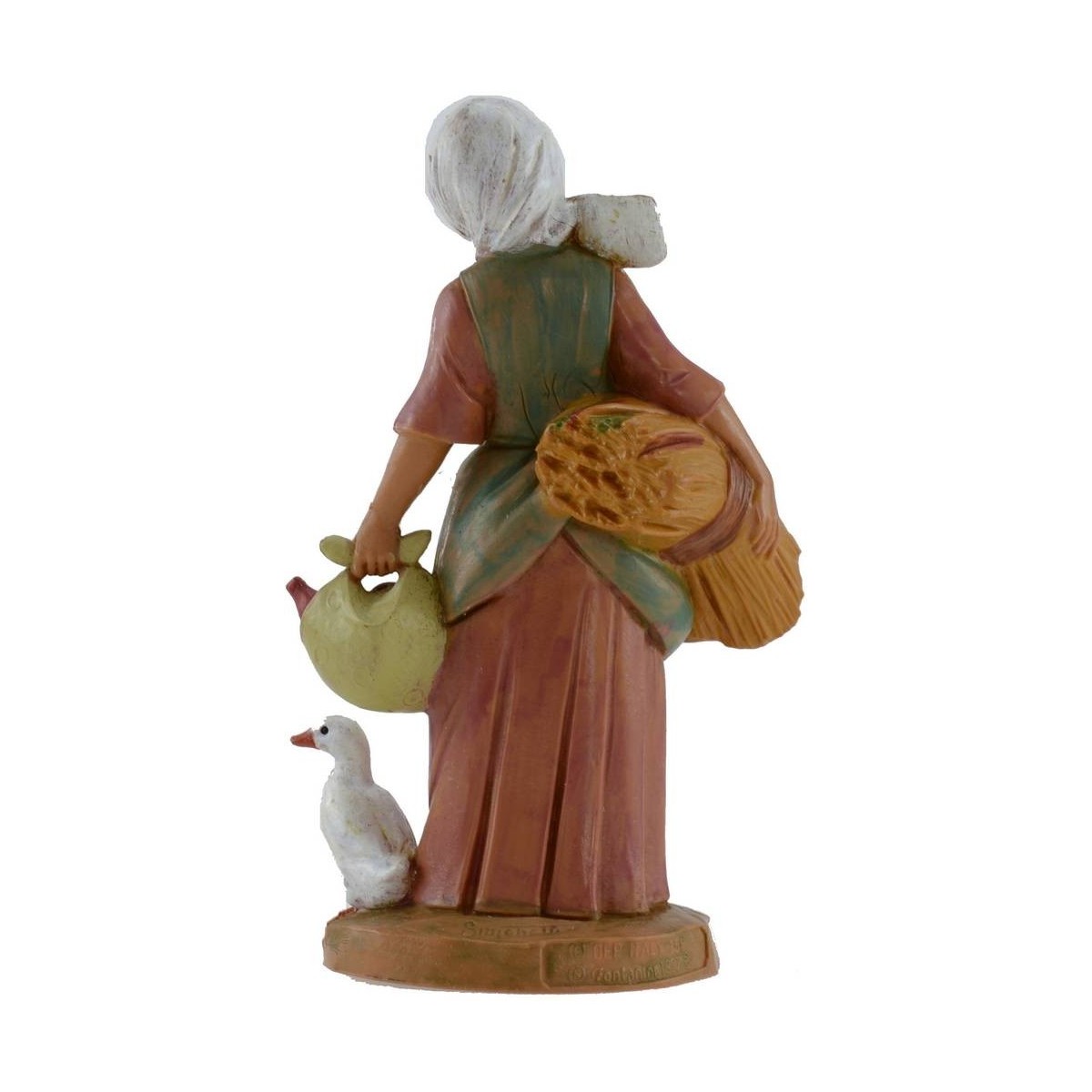 Contadina al lavoro con fascina, fagotto e oca serie 12 cm Fontanini dipinto a mano. Le statue del presepe tradizionale Fontanini hanno volti espressivi e ben rifiniti nei dettagli.