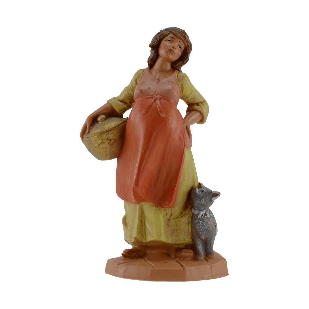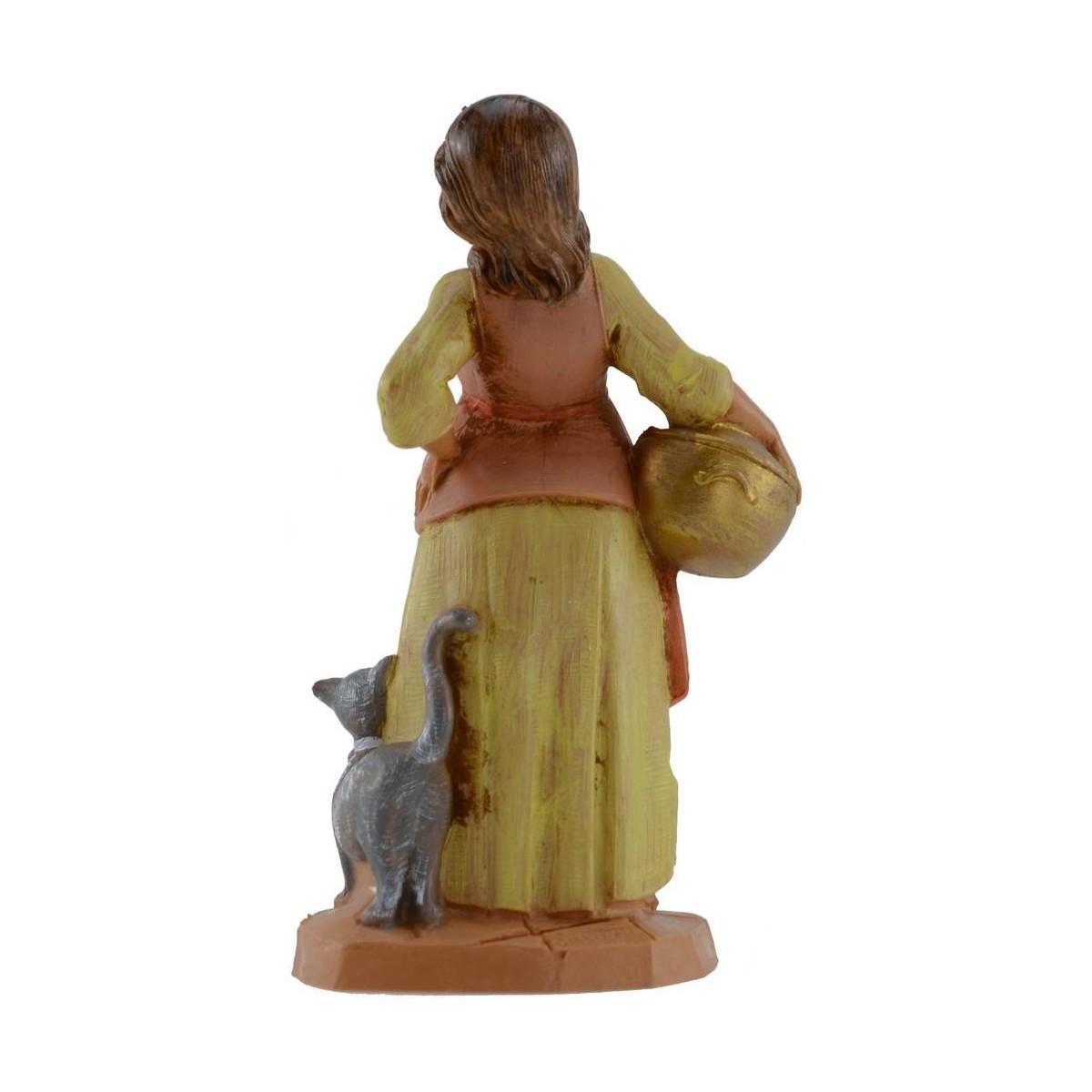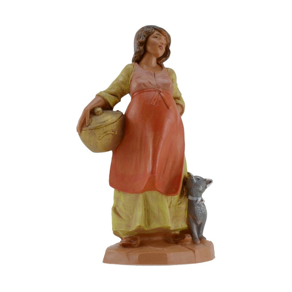 Donna incinta con pentola e gattino ai suoi piedi,serie 12 cm Fontanini dipinto a mano. Le statue del presepe tradizionale Fontanini hanno volti espressivi e ben rifiniti nei dettagli.