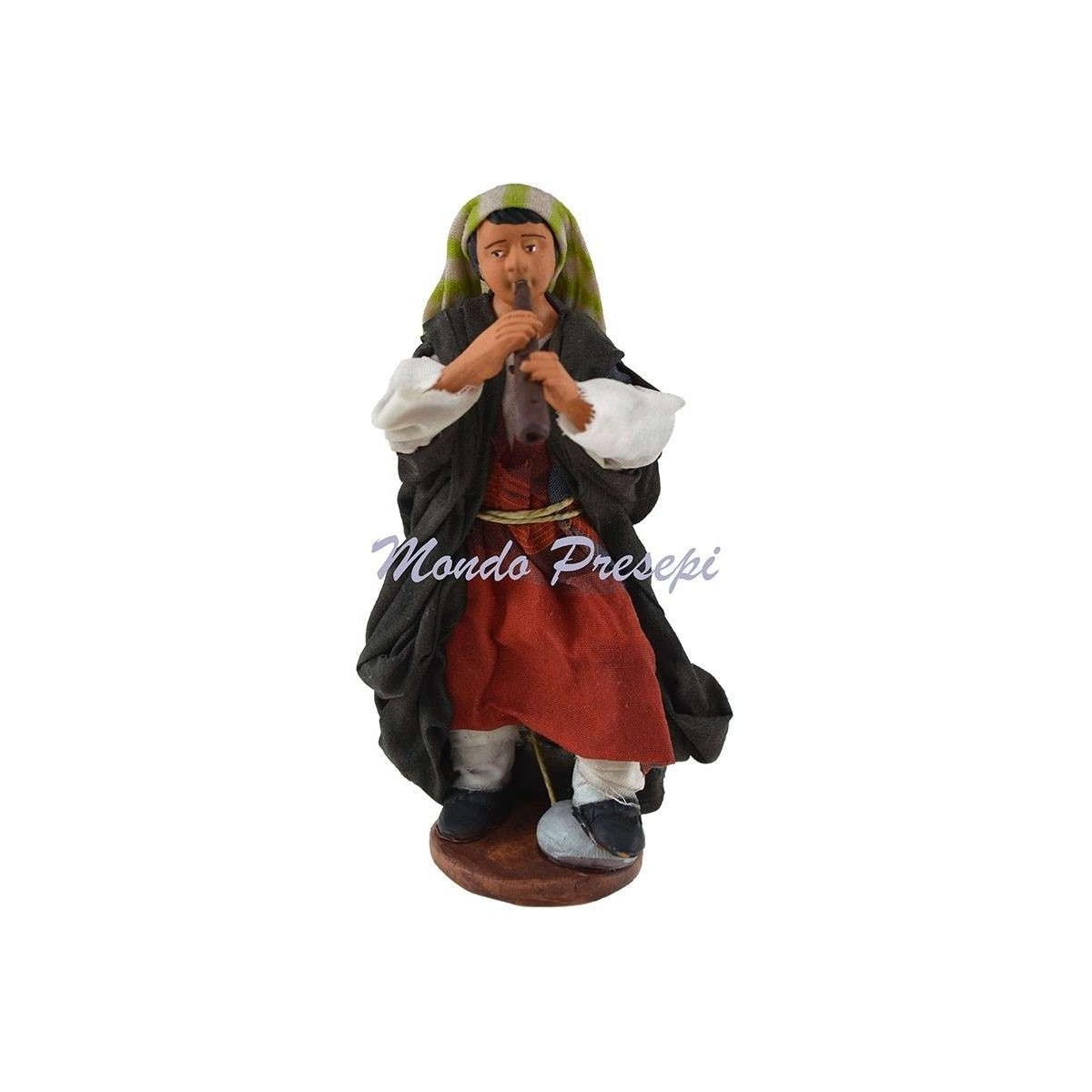 Suonatore di flauto, statua in terracotta artistica rifinita nei particolari e vestita con tessuto indurito.