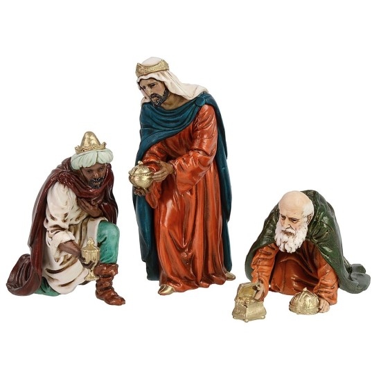Tre Re Magi, uno in piedi e due inginocchiati cm 13 Landi Moranduzzo, la sopracitata serie è caratterizzata da statue ben rifinite nei dettagli, con volti espressivi e dall'utilizzo di colori molto realistici.