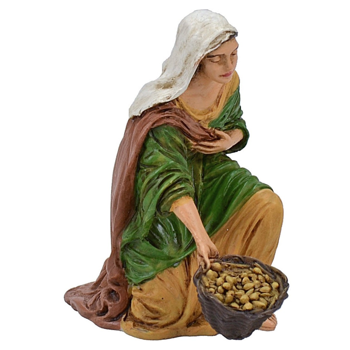 Donna inginocchiata con cesto in resina della serie 13 cm Pigini.