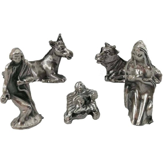 Natività 5 pezzi in metallo (peltro) composta da: San Giuseppe, Maria Gesù nella culla, bue e asino. Ideale per realizzare piccoli presepi in miniatura.