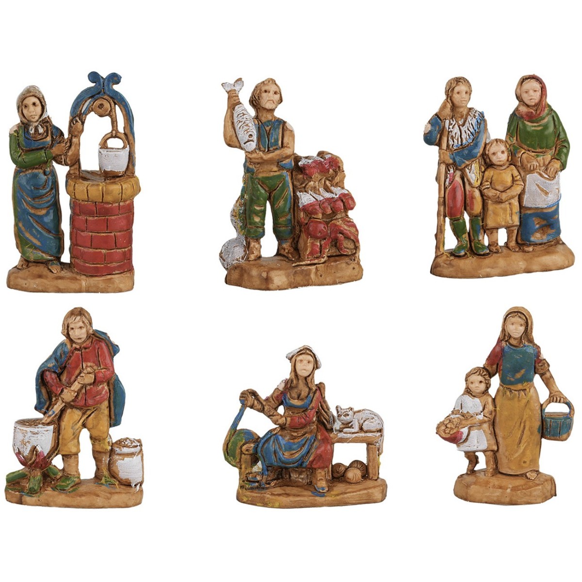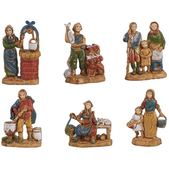 Set 6 personaggi serie 3,5 cm per presepe in pvc composto da: acquaiola, pescivendolo, famiglia, castagnaro, filatrice, donna e bambina con ceste. Si precisa che tutte le statuine Euromarchi sono realizzate in Italia.