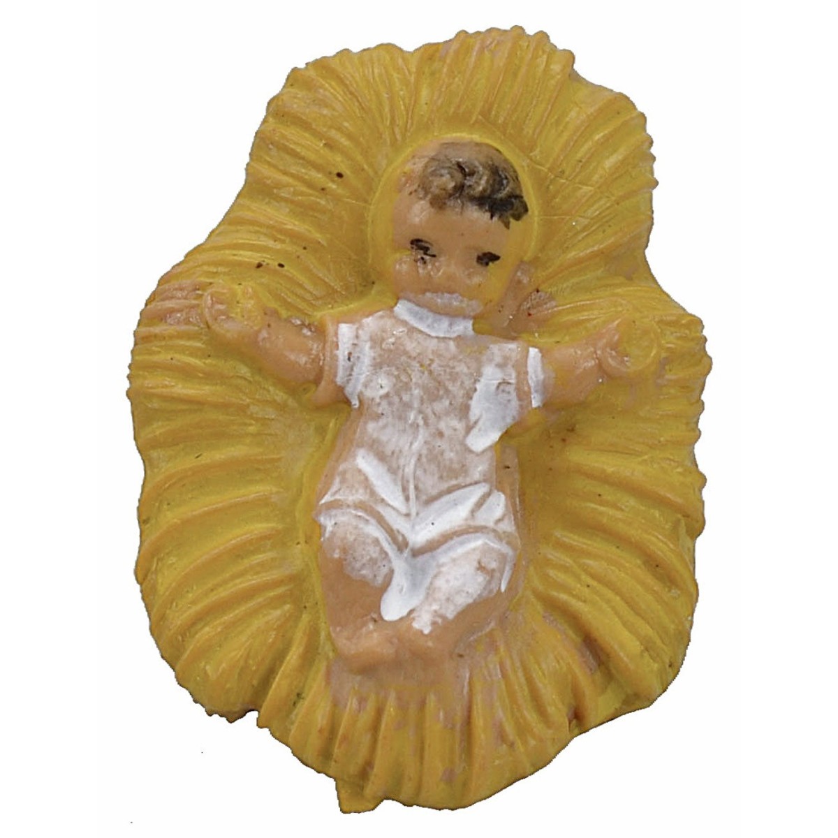 Natività composta da San Giuseppe con bastone, Maria inginocchiata e Gesù nella culla serie 4 cm lux in pvc. Nei correlati sotto la tabella sono disponibili bue e asino acquistabili separatamente.