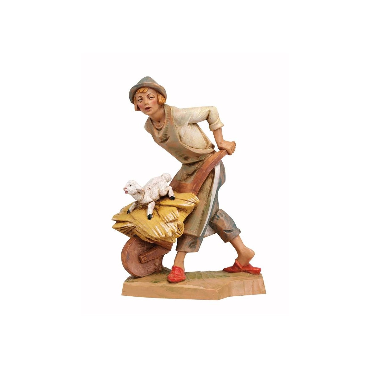 Contadino con carriola di fieno e pecora serie 19 cm Fontanini dipinto a mano. Le statue del presepe tradizionale Fontanini hanno volti espressivi e ben rifiniti nei dettagli.