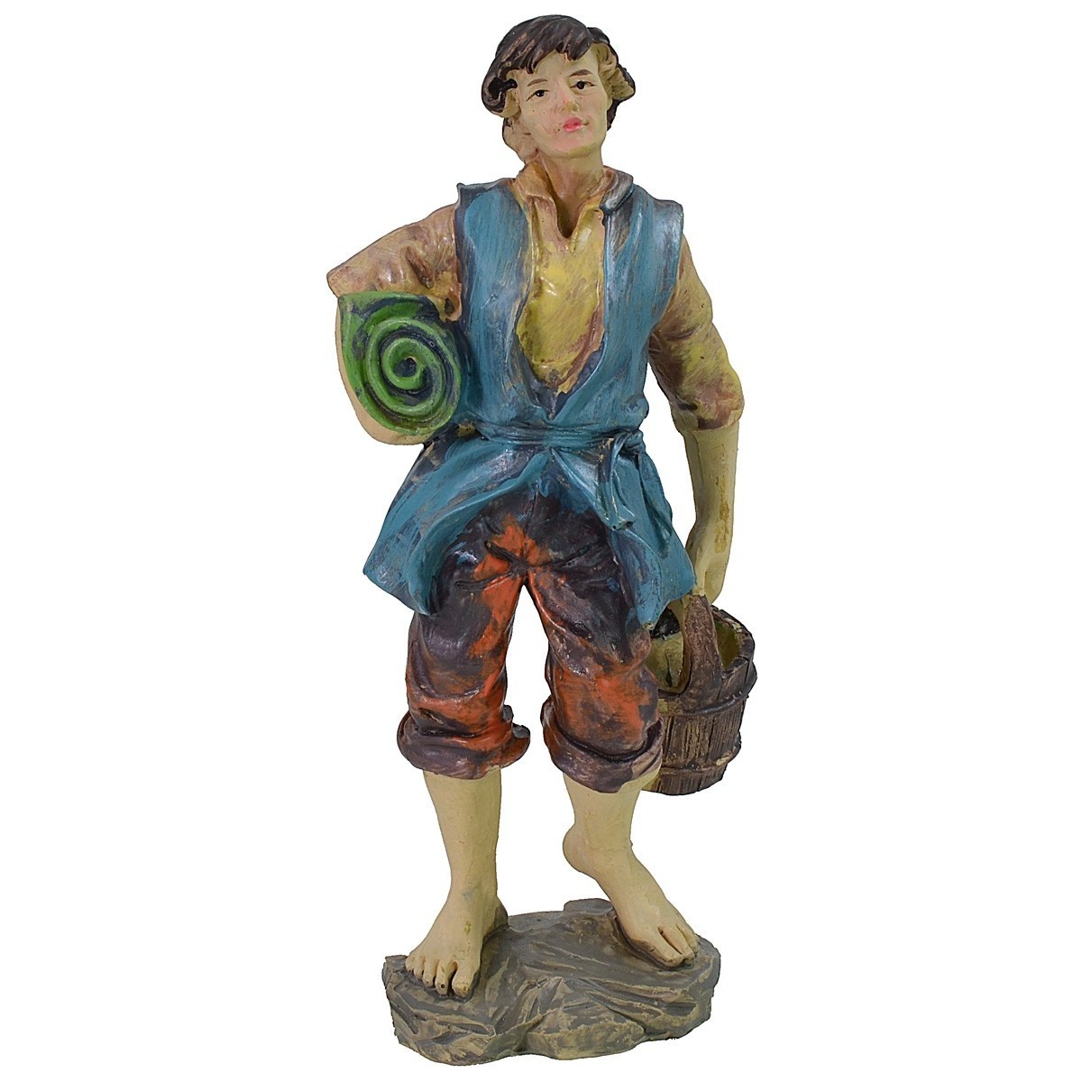 Ragazzo in resina 20 cm che sorregge un rotolo di stoffa sotto il braccio destro, mentre con il sinistro tiene un secchio di legno.
