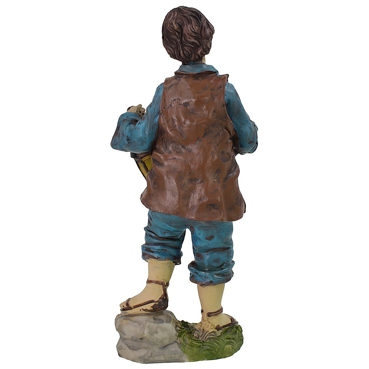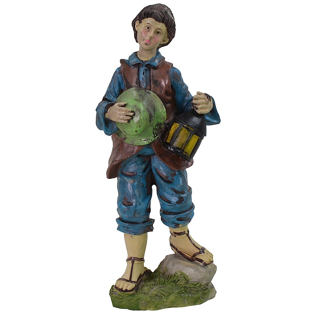 Ragazzo in resina 25 cm, con la mano destra tiene un cappello verde, mentre con quella sinistra regge una lanterna.