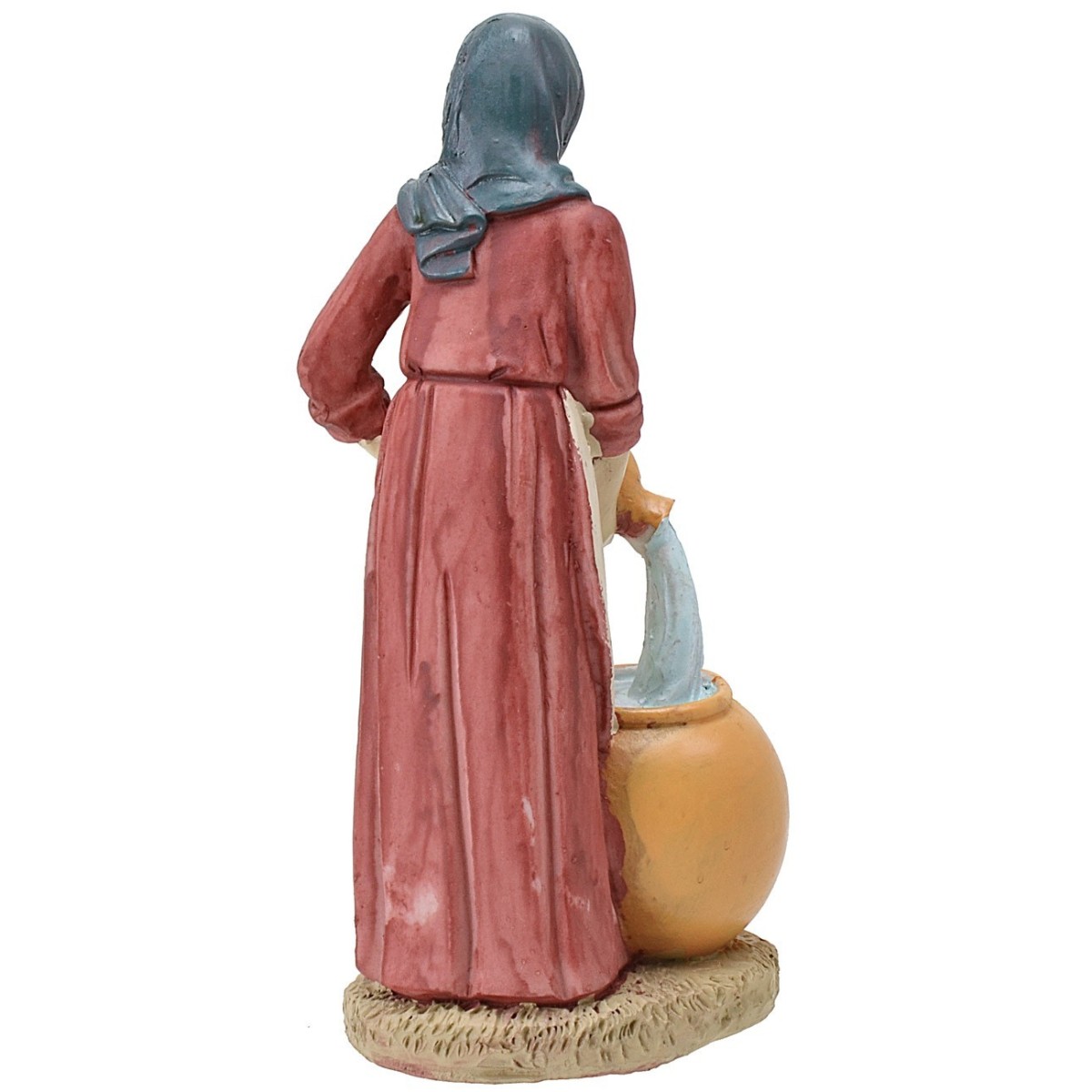 Donna con anfore 20 cm in resina con viso espressivo e ben rifinito, porta un copricapo blu ed una veste rossa con un grembiule bianco; regge un' anfora con cui sta travasando l' acqua in una grande tinozza.