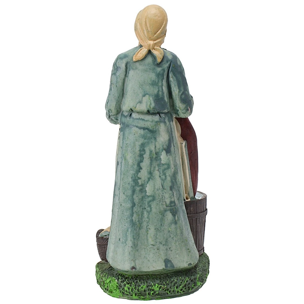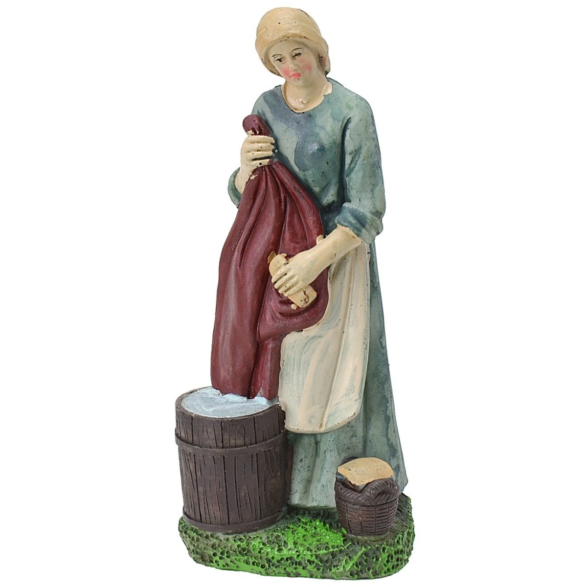 Lavandaia in resina 20 cm con viso espressivo e ben rifinito, porta un copricapo ed una veste azzurra con un grembiule bianco; tra le mani regge un grande lenzuolo rosso che sta lavando nella tinozza piena d'acqua.