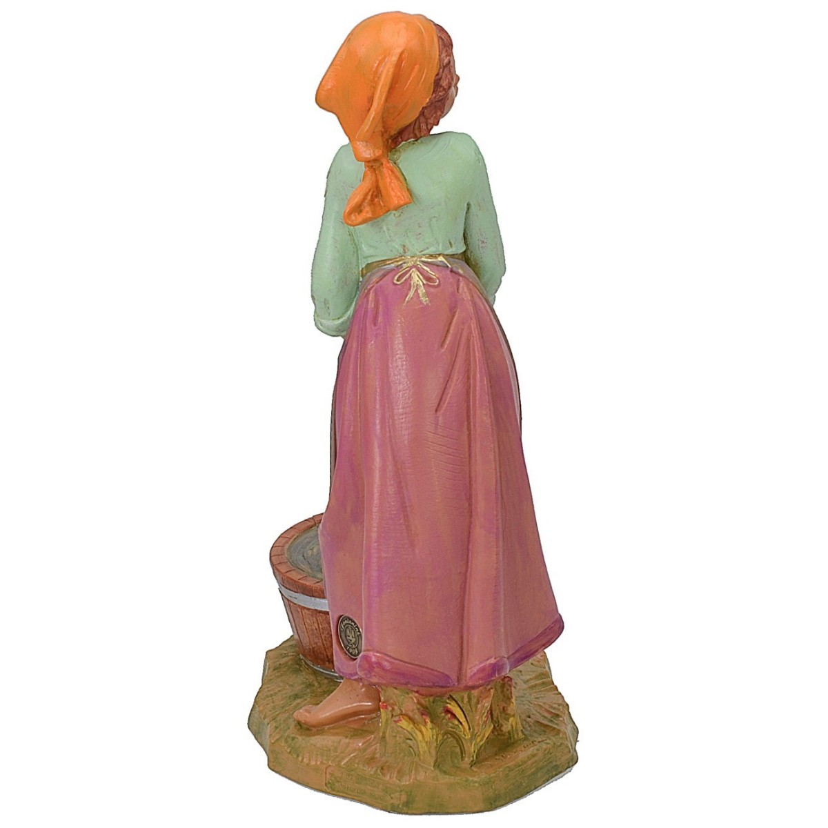 Donna che lava i panni sull'asse in una tinozza serie 30 cm Fontanini dipinta a mano. Le statue del presepe tradizionale Fontanini, prodotte a mano in Italia, hanno volti espressivi e ben rifiniti nei dettagli.