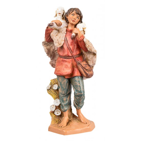 Pastore con pecora sulle spalle 30 cm Fontanini dipinto a mano ed adatto anche per ambienti esterni. Statua del presepe tradizionale Fontanini con volto espressivo e ben rifinita nei dettagli.