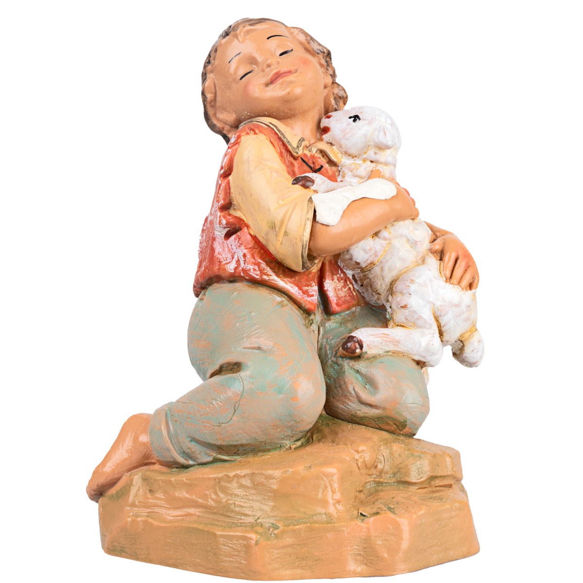 Bimbo inginocchiato con agnello in braccio serie 30 cm Fontanini, dipinto a mano. Statua del presepe tradizionale Fontanini con volto espressivo e ben rifinita nei dettagli.