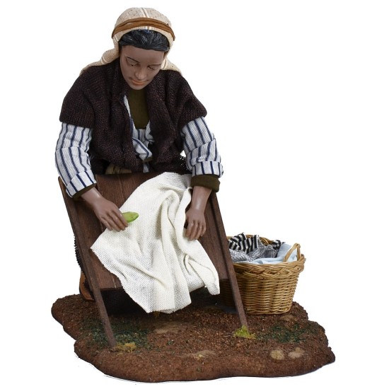 Lavandaia in resina serie 30 cm Pigini, la statua è in ginocchio che lava i panni sull'asse in legno. Statua con volto molto espressivo, rifinita nei minimi dettagli e vestita con abiti in tessuto. E' possibile modificare la posizione della statua.