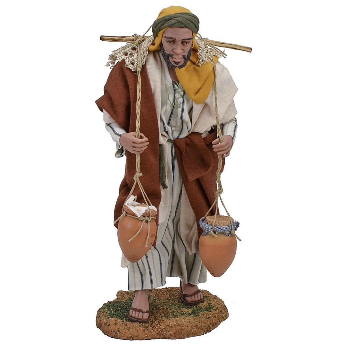 Acquaiolo palestinese che trasporta due giare di terracotta. Statua artistica per presepe di altezza 30 cm realizzata in resina, la meticolosità nello studio dei dettagli e l'espressività dei visi sono caratteristiche che contraddistinguono tutta la serie Pigini oltre che abiti in tessuti finemente cuciti a seconda dei soggetti. E' possibile modificare la posizione di ogni statue ed eliminare la base a seconda delle esigenze. Si fa presente che essendo un prodotto totalmente artigianale i colori degli abiti potrebbero variare.