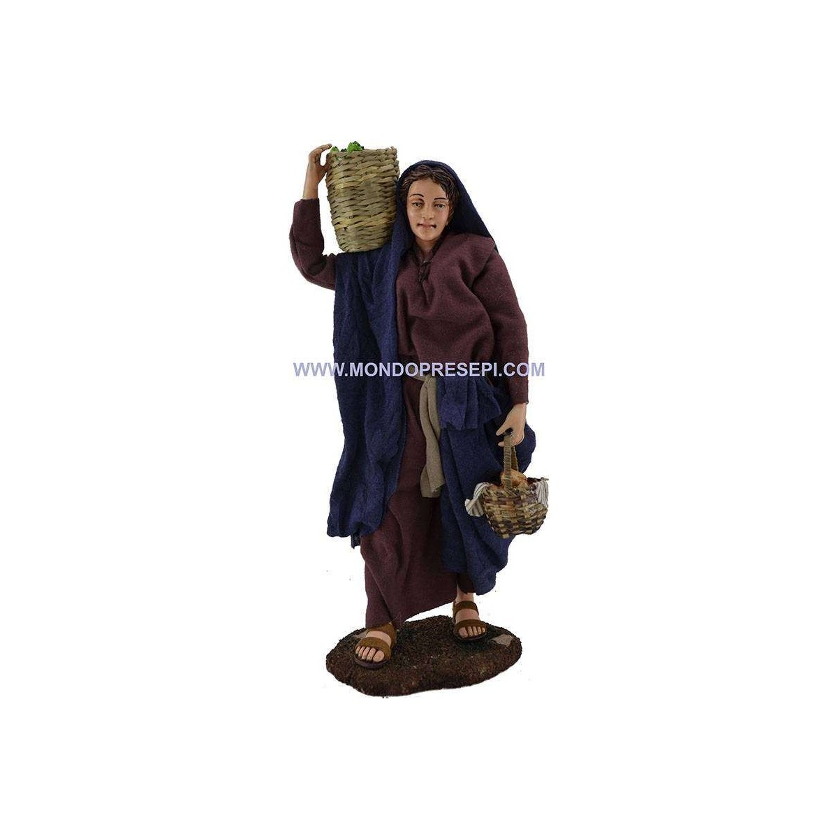 Donna con i cesto di frutta sulle spalle e cesto di pane tra le mani.