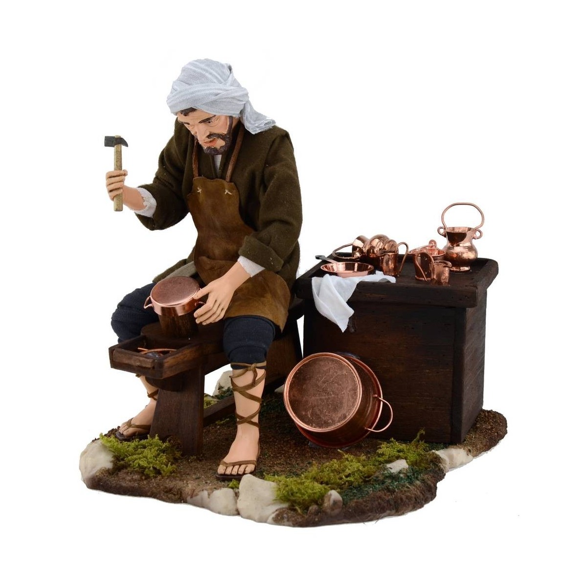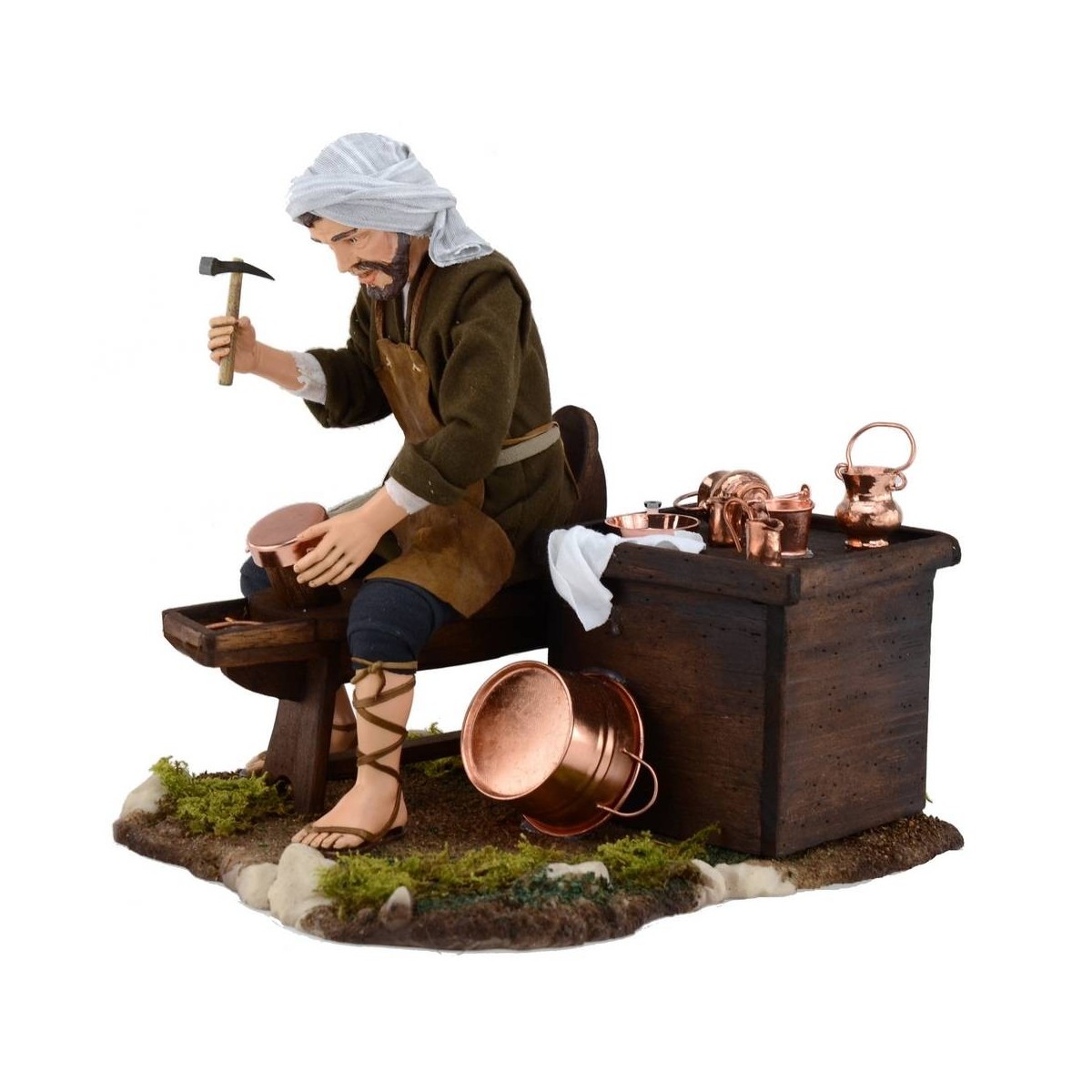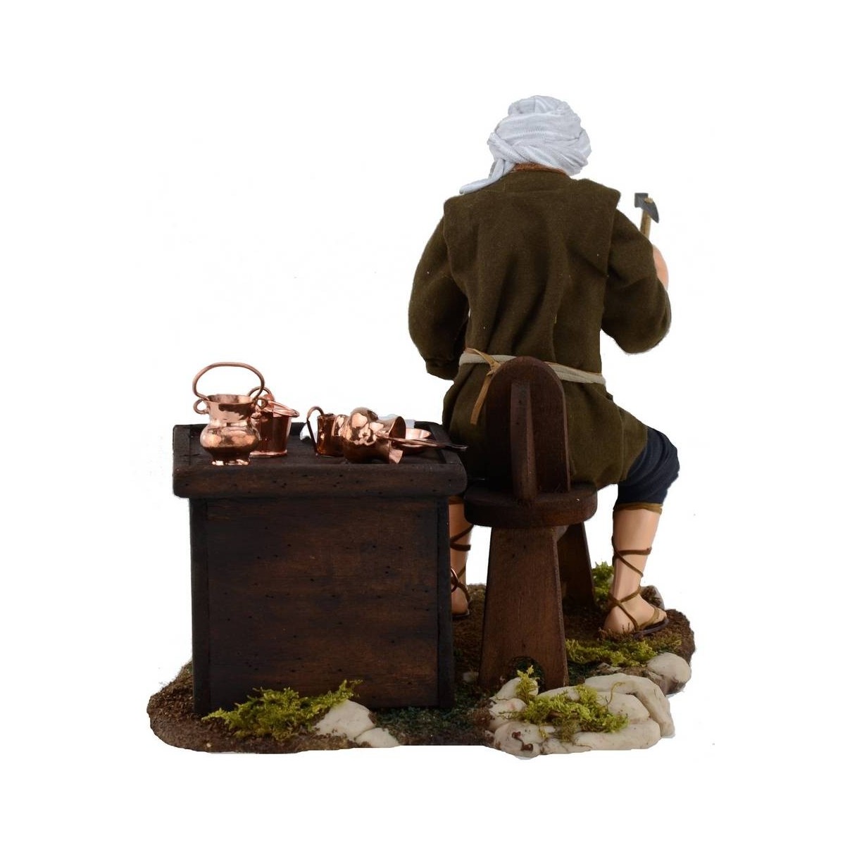 Ramaio in resina al lavoro serie 30 cm della Pigini, la statua è vestita in tessuto e la composizione presenta sul bancone minuteria in rame ben rifinita.