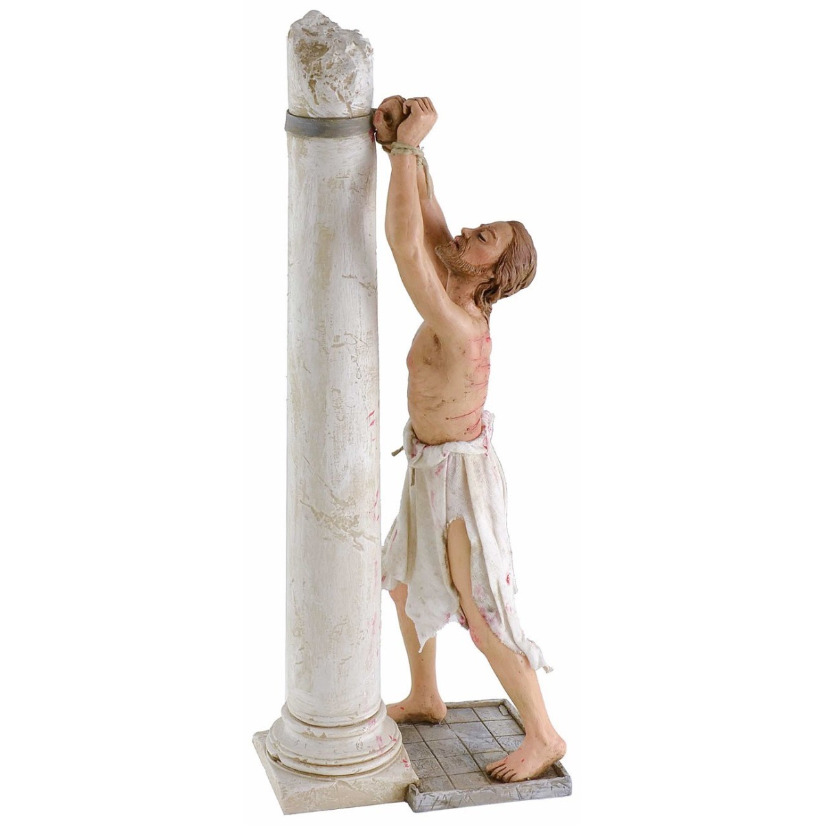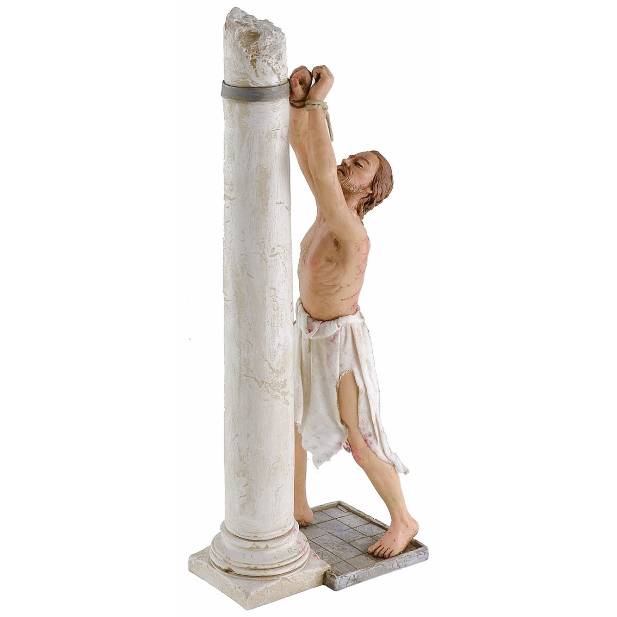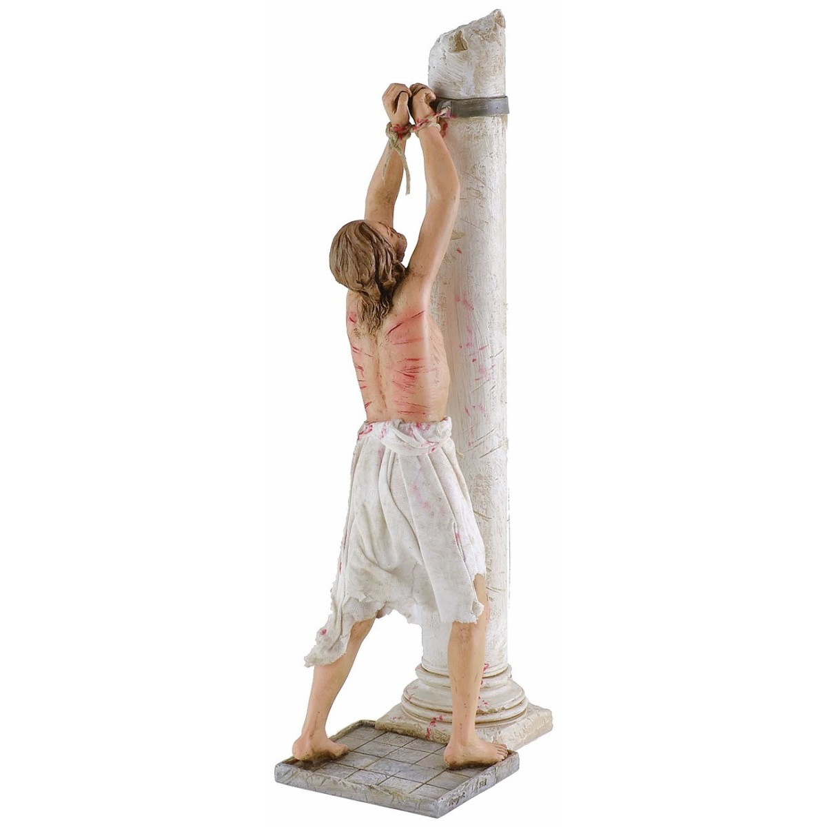 Statua artistica di Gesù legato alla colonna raffigurante la scena della flagellazione. La statua è ben rifinita nei dettagli: realizzata interamente in resina rivestita con stoffe e dipinta a mano da sapienti mani artigiane. Il volto risulta molto espressivo e rifinito nei particolari.