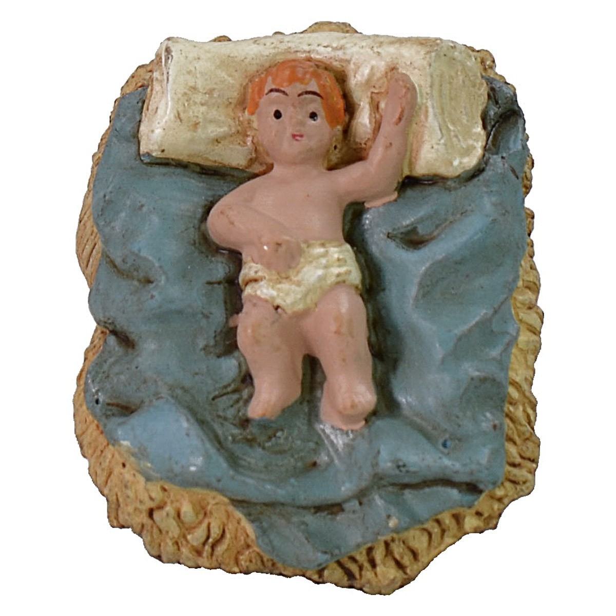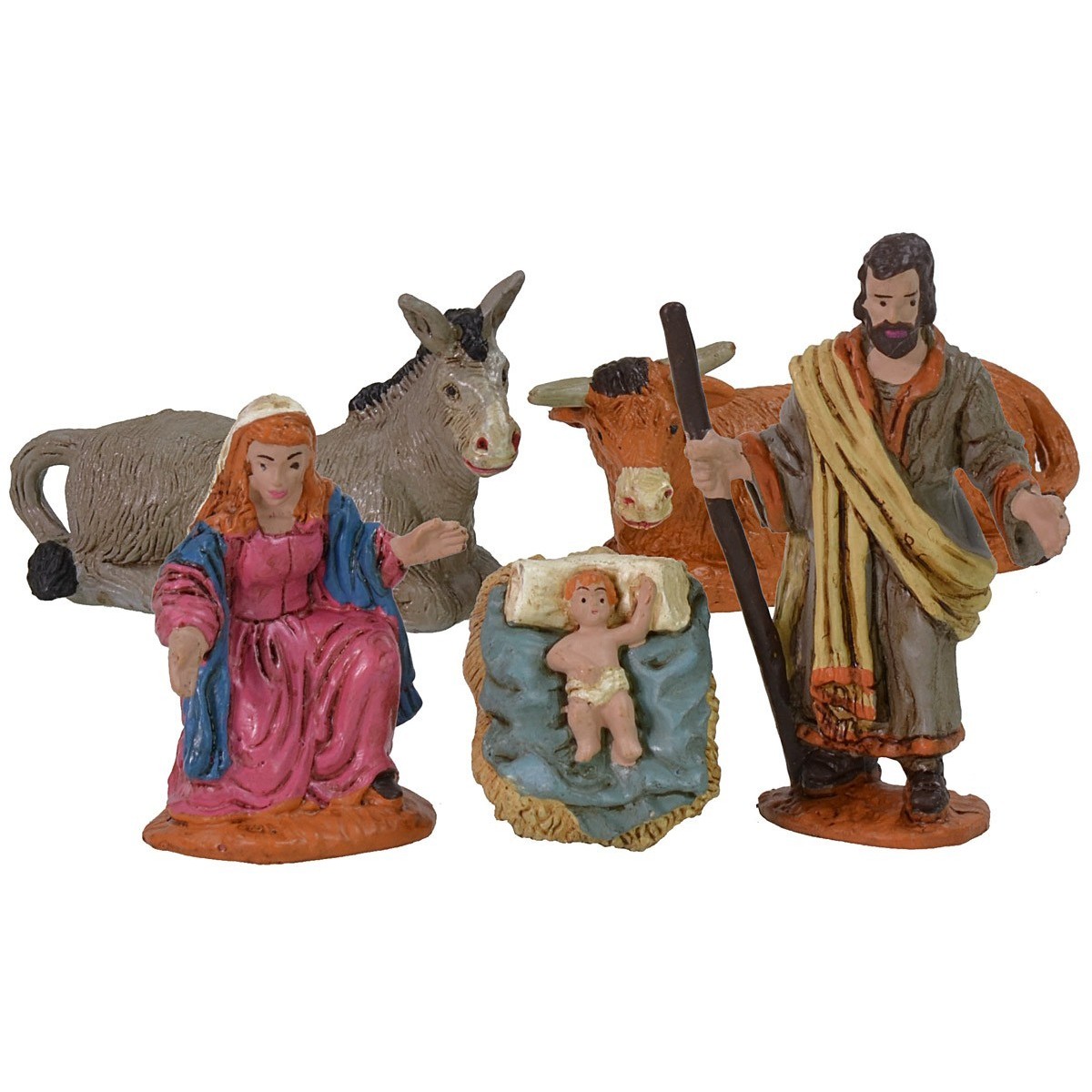 Natività a cinque soggetti composta da: San Giuseppe con bastone, Maria con le braccia aperte verso il bambinello, Gesù nella culla, bue ed asino. Le 5 statuine per Presepe sono in durexina tipo pvc della serie 5 cm. Si precisa che il Bambino non è separato dalla culla.