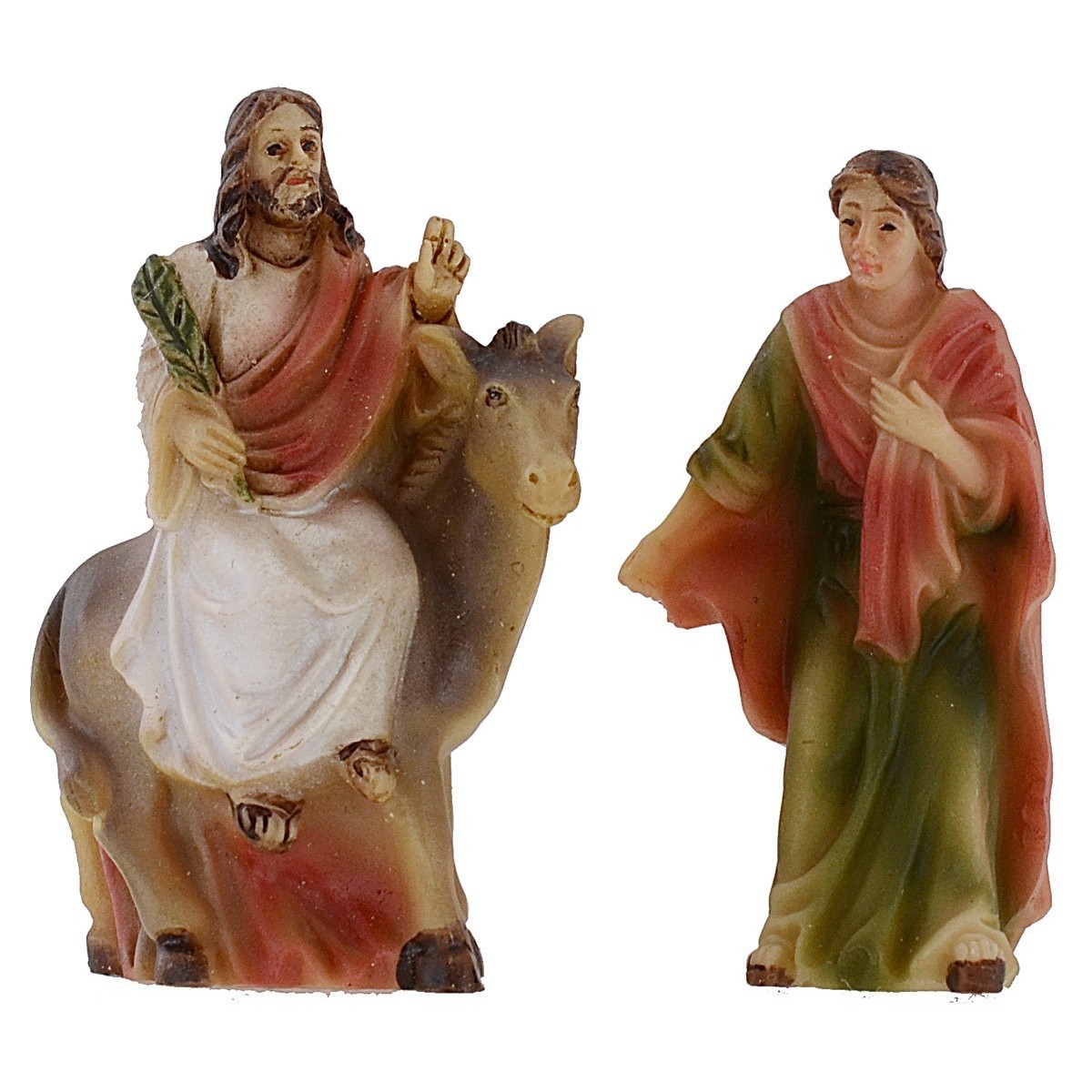 Set di 2 statue Pasquali per la rappresentazione della scena della Domenica delle Palme. In questo giorno si ricorda il trionfale ingresso a Gerusalemme di Gesù, in sella ad un asino, osannato dalla folla che lo salutava agitando i rami di Palma. Nei prodotti correlati, di seguito elencati, è possibile vedere delle statue complementari alla scena in oggetto. Le statue della medesima serie hanno volti espressivi e ben rifiniti nei dettagli e sono realizzate interamente in resina. Il prodotto è ideale per la creazione di composizioni Pasquali come Diorami e Presepi.