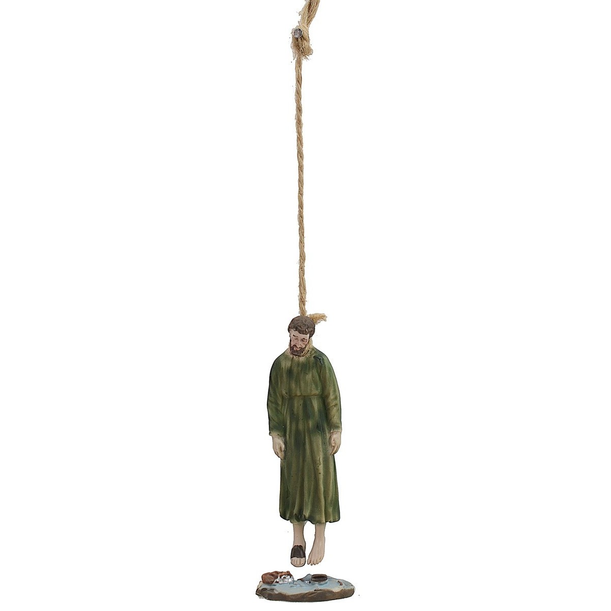 Giuda Iscariota impiccato, una lunga fune che termina attorno al collo dell'apostolo traditore. La statua risulta molto realistica e rifinita nei minimi dettagli. come la ciabatta una sul piede del corpo esamine e l'altra a terra sulla base mobile. La statue è in resina di altezza 5 cm.