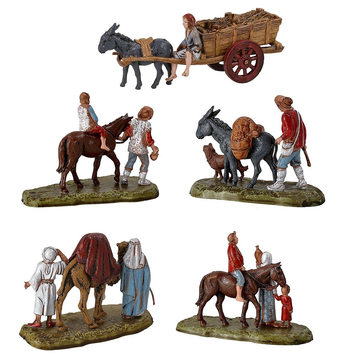 Set 5 scene 6 cm Landi Moranduzzo composte da: l'uomo con carro, cammellieri con cammello, viandante con asino, uomo con bambino a cavallo e uomo a cavallo e donna con bambina. Precisiamo che la serie 6 cm ha un'altezza reale di circa 5,5 cm.