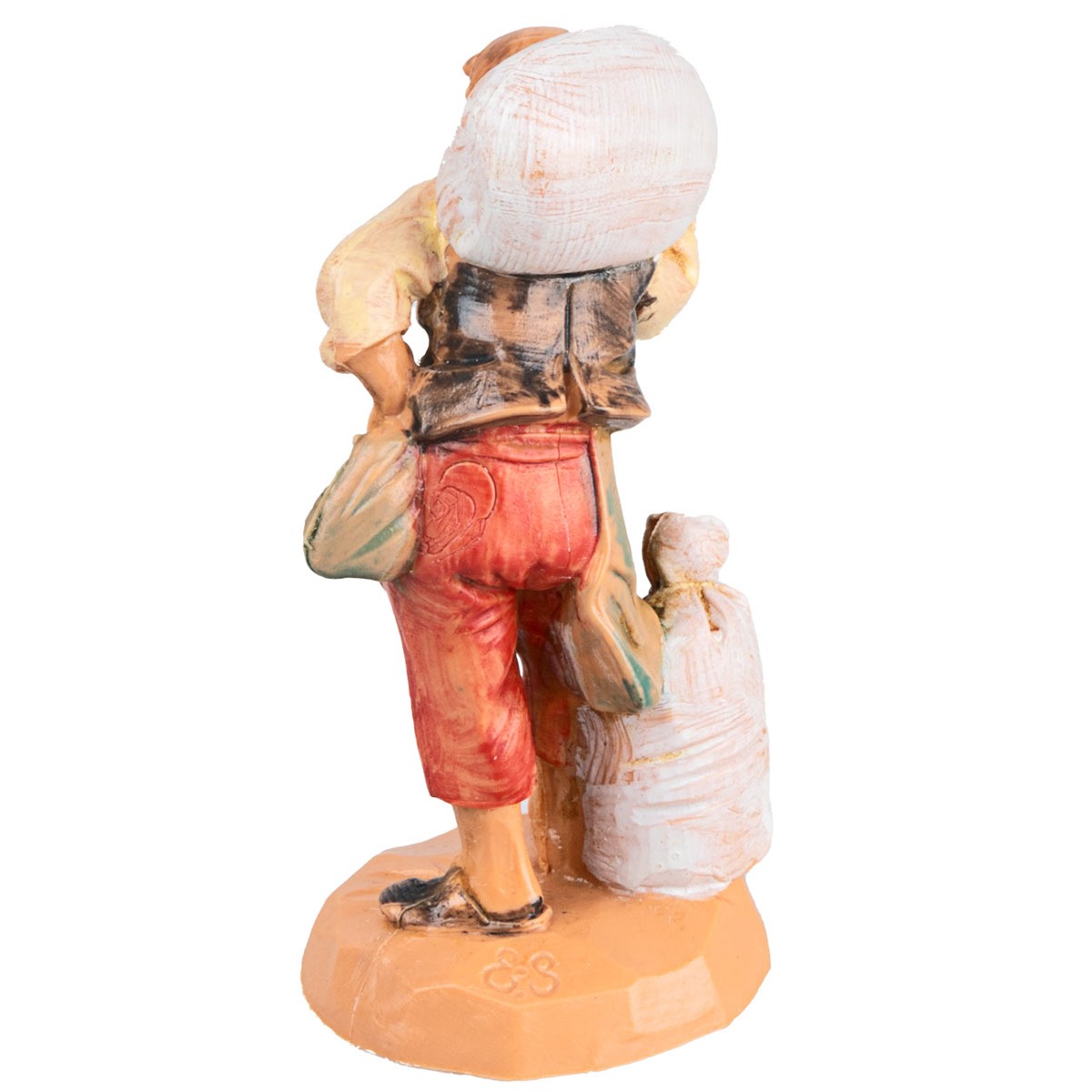 Mugnaio 6,5 cm Fontanini con due sacchi uno a terra e uno a spalle, statua dipinta a mano. Le statue del presepe tradizionale Fontanini hanno volti espressivi e ben rifiniti nei dettagli.