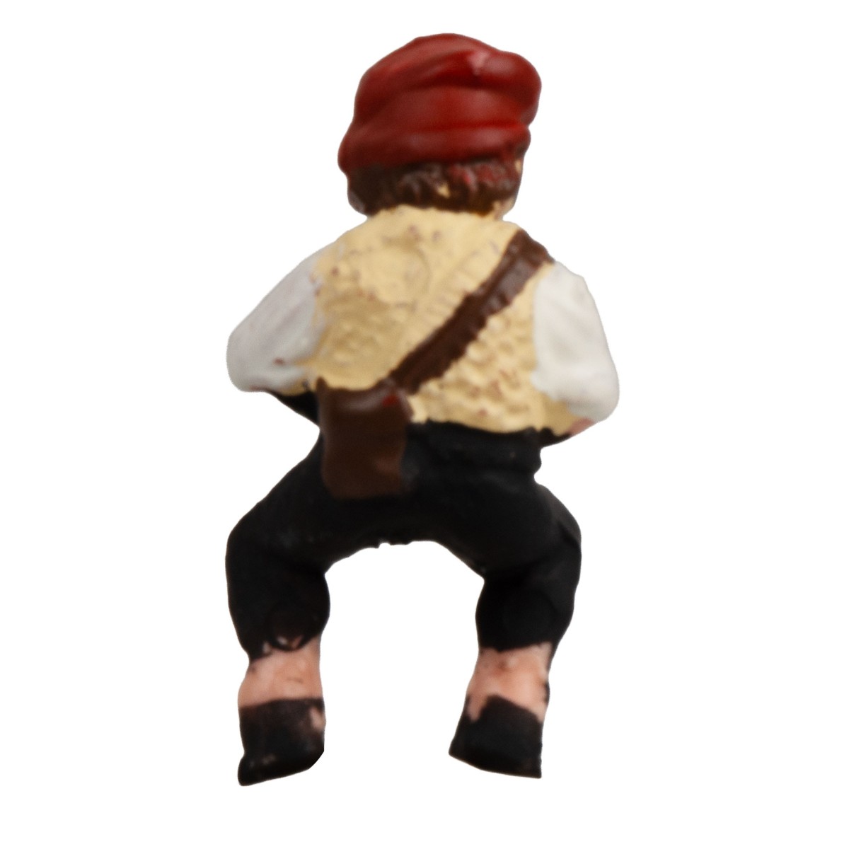 La statuina raffigura un bambino seduto con le braccia conserte e le mani appoggiate davanti al corpo. Indossa un copricapo rosso, camicia chiara, pantaloni scuri e tracolla sul petto, con una posa semplice adatta alle scene popolari del presepe.