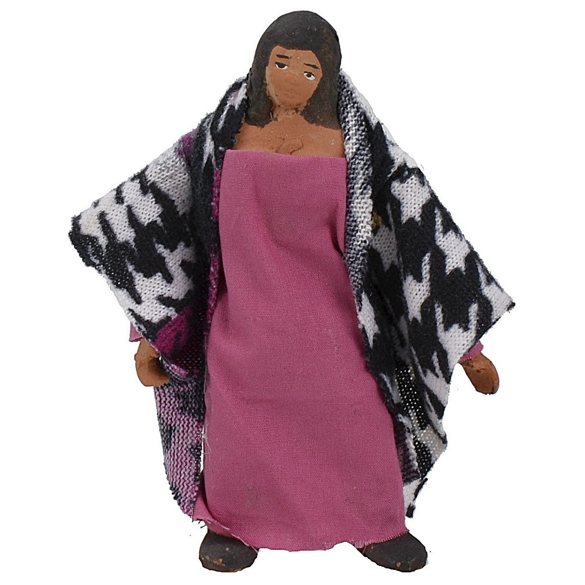 Donna in terracotta snodato serie 11 cm vestita con abiti in tessuto. La statua è nella posizione in piedi con il busto e le braccia snodate, risulta ideale per la realizzazione di movimenti per il presepe fai da te o  per essere utilizzare fissa e riposta nella posizione desiderata. L'articolo è realizzato completamente a mano, pertanto, potrebbero variare i colori rispetto alla foto.