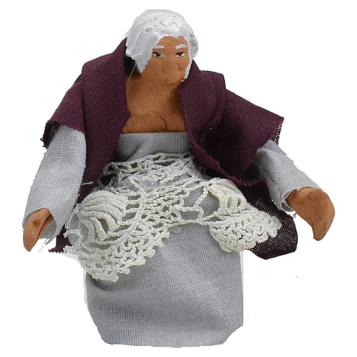 Donna in terracotta snodata serie 10 cm vestita con abiti in tessuto. La statua è nella posizione seduta con un braccio predisposto al movimento su/giù e il busto snodato, può essere utilizzata fissa e riposta nella posizione desiderata. Date le sue caratteristiche risulta ideale per la realizzazione di movimenti per il presepe fai da te come: la donna che fila, ricama, mangia, ecc . L'articolo è realizzato completamente a mano, pertanto, potrebbero variare i colori rispetto alla foto.
