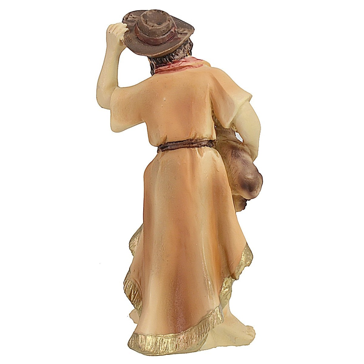Pastore con cucciolo di cane in braccio, la statuina di resina è ben dettagliata.