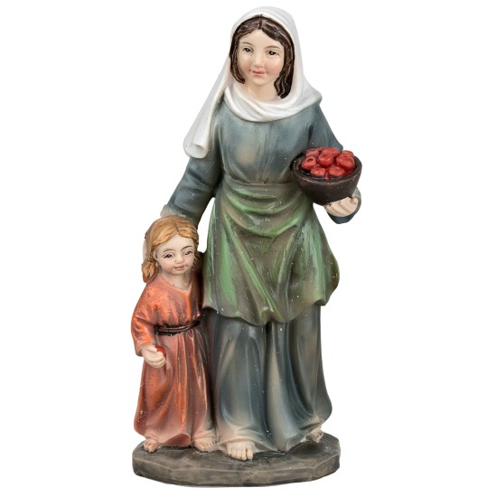 La scena raffigura una mamma a piedi scalzi con un cesto colmo di mele tra le mani. Accanto a lei, la bambina la abbraccia tenendo una mela in mano. I due personaggi indossano abiti semplici dai toni naturali. Ideale per completare scene di vita quotidiana nel presepe.
