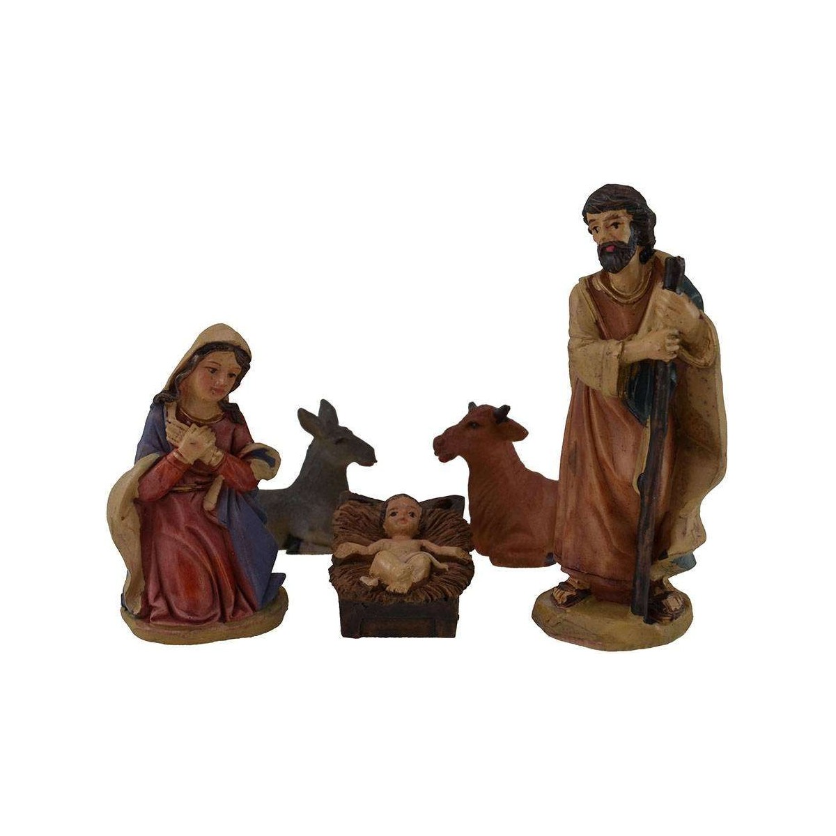 Natività in resina set 5 soggetti: S. Giuseppe, Maria, Bambinello nella culla, bue e asino.