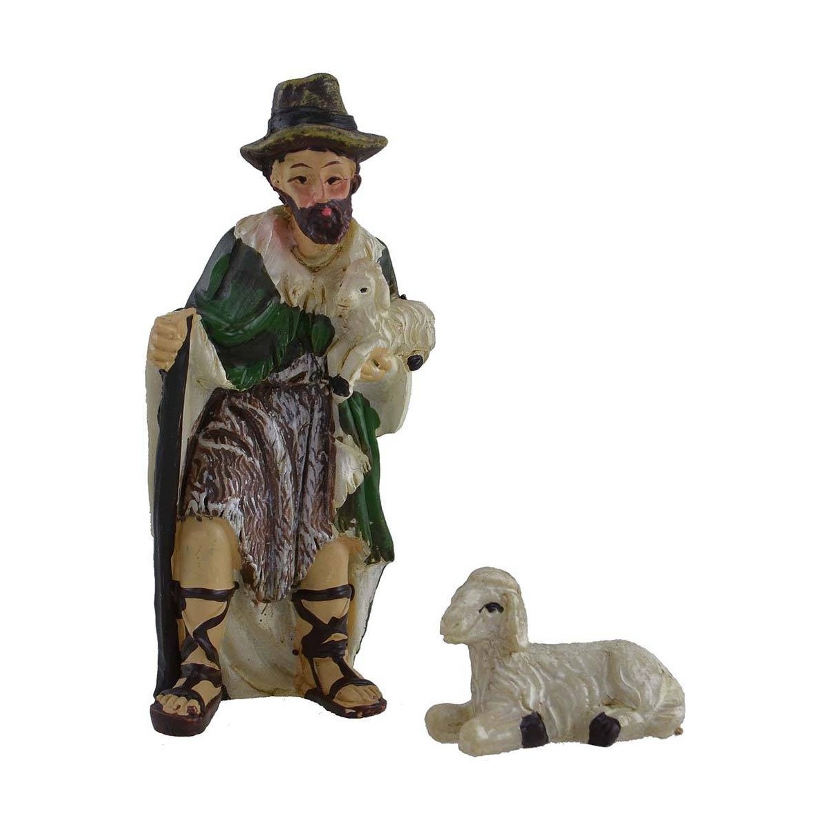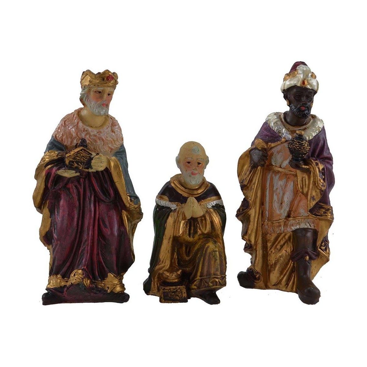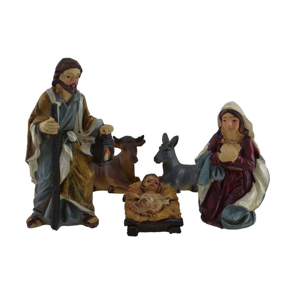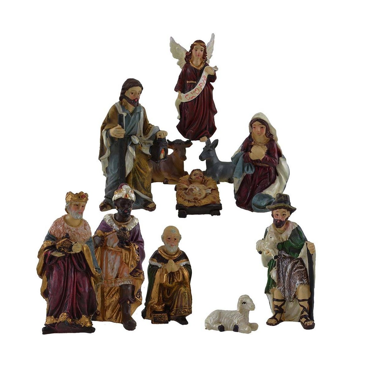 Set di 11 pezzi composta da: San Giuseppe, Maria, Gesù nella culla, bue, asino, tre Re Magi, angelo, pastore e pecora. Statue per presepe in resina dipinte, altezza 9 cm.