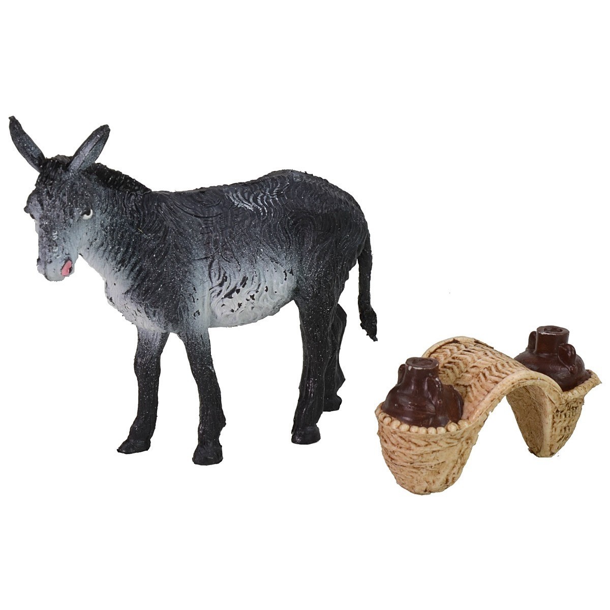 Asino in pvc consigliato per statue di altezza 8-10 cm, l'animale porta a spalle delle ceste con due brocche d'acqua che possono anche essere rimosse.