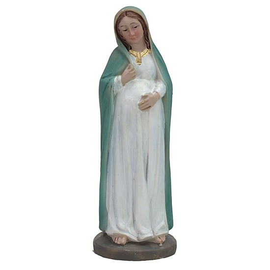 Maria in dolce attesa 9 cm in resina, ha un viso con un espressione serena, dei capelli castani coperti da un lungo velo azzurro oro sostenuto con la mano destra, mentre con la sinistra accarezza il pancino. La veste candida, che le segna le forme materne, cade fino ai piedi di cui si intravedono le dita.