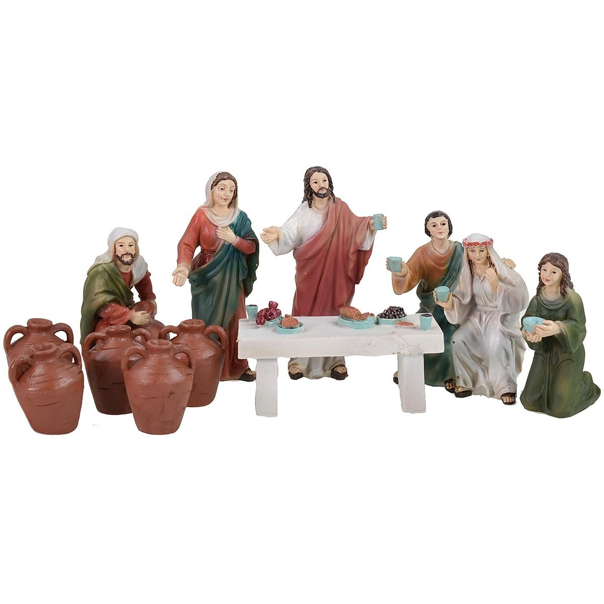 Set di 5 figure Pasquali per la rappresentazione delle Nozze di Cana. Possiamo distinguere Gesù, al centro della tavola, intento a compiere il suo Primo Miracolo: la Tramutazione dell'acqua in vino. Il tavolo della scena risulta essere anch'esso in resina ed è molto caratteristico per le minuterie che lo riempiono e decorano. Si fa inoltre presente che le 5 anfore che circondano il pastore sono tutte mobili e non unite fra loro. Le statue della medesima serie hanno volti espressivi e ben rifiniti nei dettagli e sono realizzate interamente in resina. Il prodotto è ideale per la creazione di composizioni Pasquali come Diorami e Presepi.