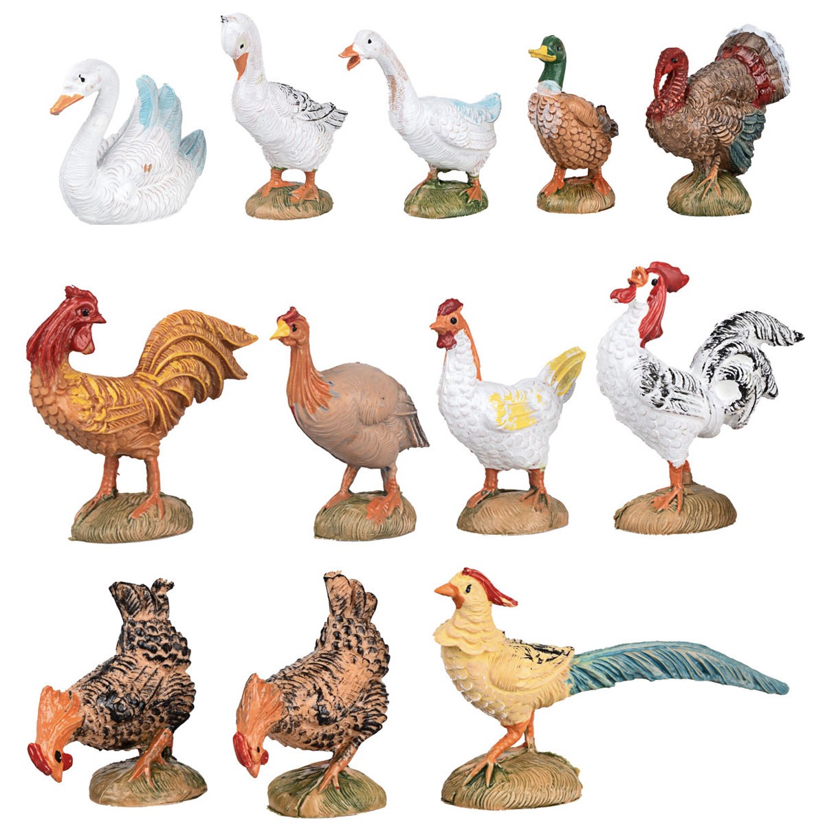 Dodici animali da cortile della Fontanini consigliato per statue di altezza 10 cm. Il set è composto da galli, galline, oca, anatra, fagiani e tacchino .