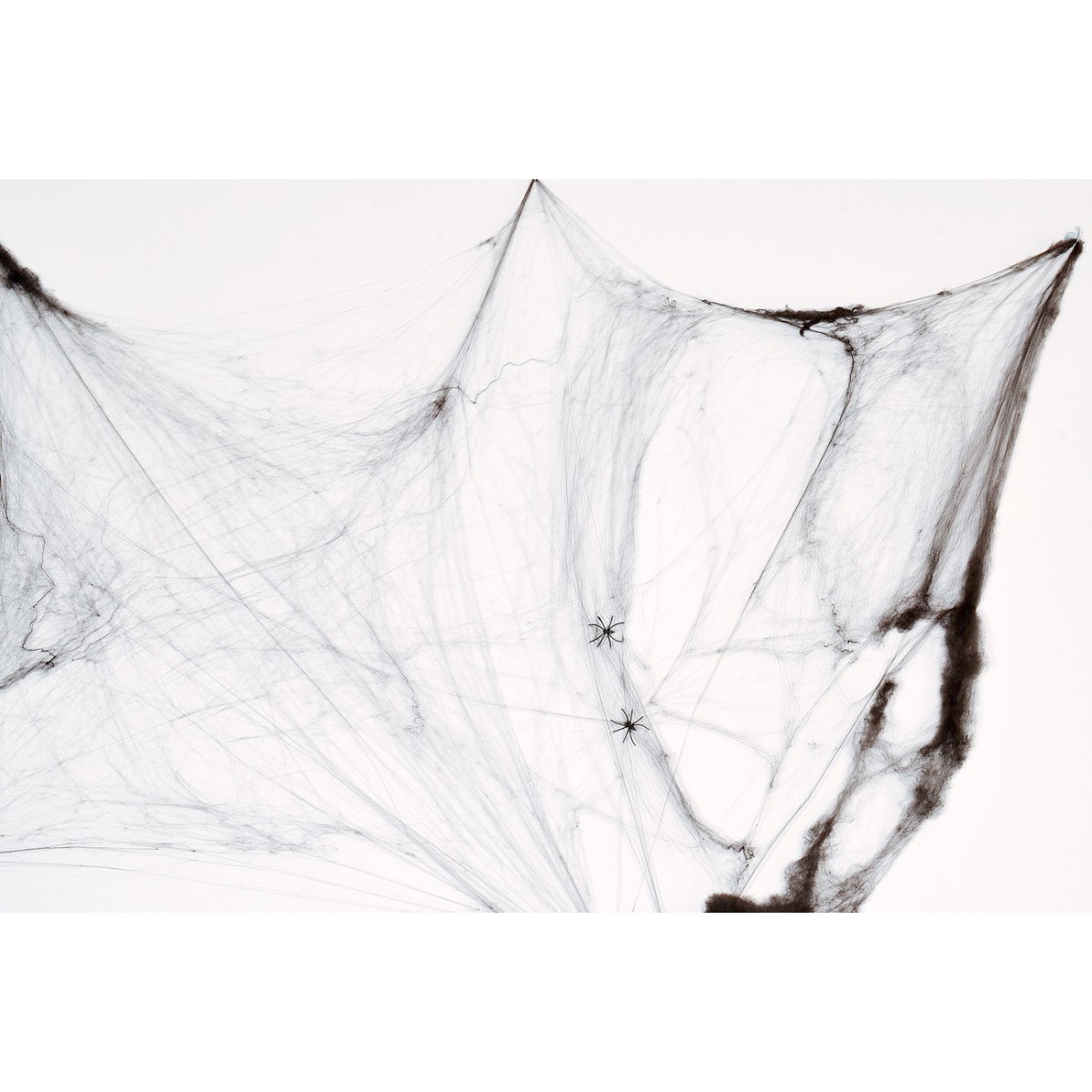 Confezione da 40 gr. di poliestere bianco lavorabile a piacimento per creare finte ragnatele, da utilizzare per scenografie di Halloween, completo di due ragni in pvc. Nelle fotografie nera e arancio è visibile come può svilupparsi la lavorazione della ragnatela.