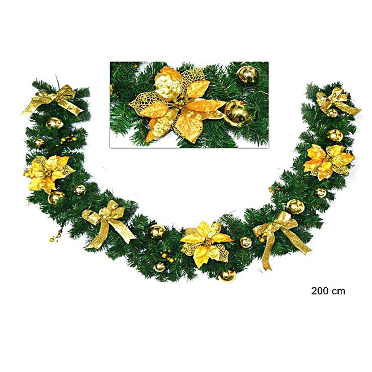 Folta ghirlanda verde della lunga 2m con addobbi color oro. E' un ottimo accessorio per decorare gli ambienti e accendere l'atmosfera natalizia. Il prodotto è realizzato in pvc e ovviamente è possibile arricchirlo con tanti prodotti disponibili nella categoria DECORAZIONI.